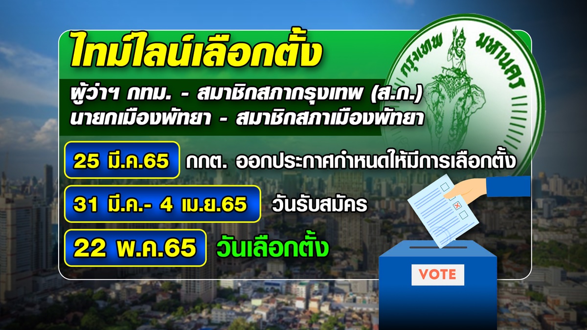 สำหรับการเลือกตั้งผู้ว่าฯ กทม. หลัง กกต.ประกาศกำหนดให้มีการเลือกตั้ง ในช่วงวันที่ 25 มีนาคมนี้ เปิดรับสมัครช่วงวันที่ 31 มีนาคม – 4 เมษายน 2565 และเลือกตั้งในวันอาทิตย์ที่ 22 พฤศจิกายน 2565 โดยจะเป็นการเลือกตั้งพร้อมกันทั้งกรุงเทพฯ และเมืองพัทยา. – สำนักข่าวไทย