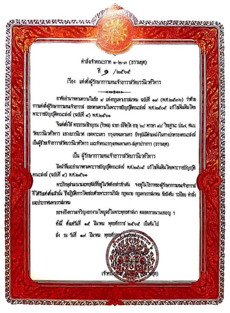 วัดบวรฯ 18 มี.ค.- เจ้าคณะภาค 1-2-3 (ธรรมยุต) มีคำสั่งตั้ง “พระธรรมวชิรญาณ” (จิรพล อธิจิตฺโต) ผู้ช่วยเจ้าอาวาสวัดบวรนิเวศวิหาร เป็นผู้รักษาการแทนเจ้าอาวาสวัดบวรฯ มีผลตั้งแต่ 15 มี.ค.65