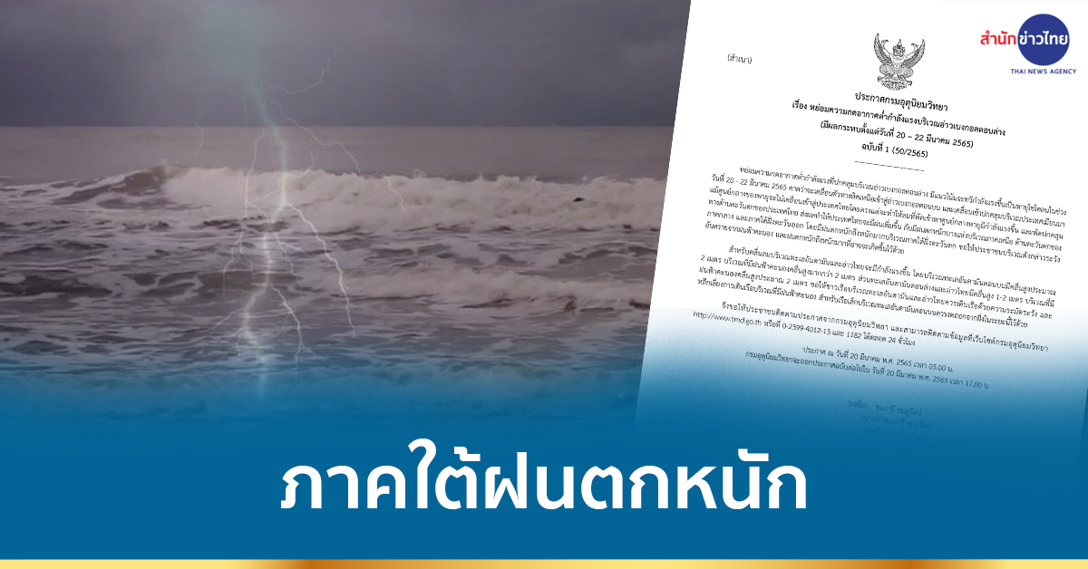 กทม. 20 มี.ค.- กรมอุตุฯ ออกประกาศฉบับที่ 1 จับตาพายุไซโคลนบริเวณอ่าวเบงกอล เตือนภาคใต้ฝั่งตะวันตก ฝนตกหนักถึงหนักมาก 20-22 มี.ค.นี้
