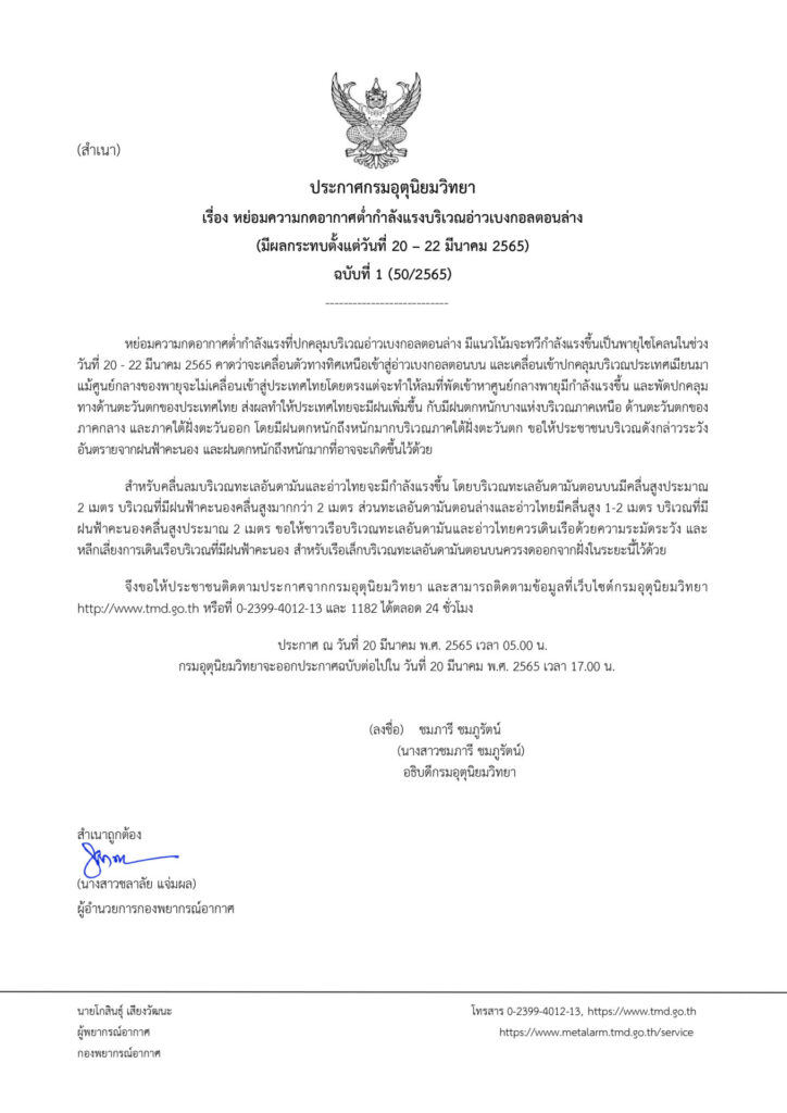 ประกาศกรมอุตุนิยมวิทยา ฉบับที่ 1 หย่อมความกดอากาศต่ำกำลังแรงบริเวณอ่าวเบงกอลตอนล่าง มีผลกระทบตั้งแต่วันที่ 20 – 22 มีนาคม 2565