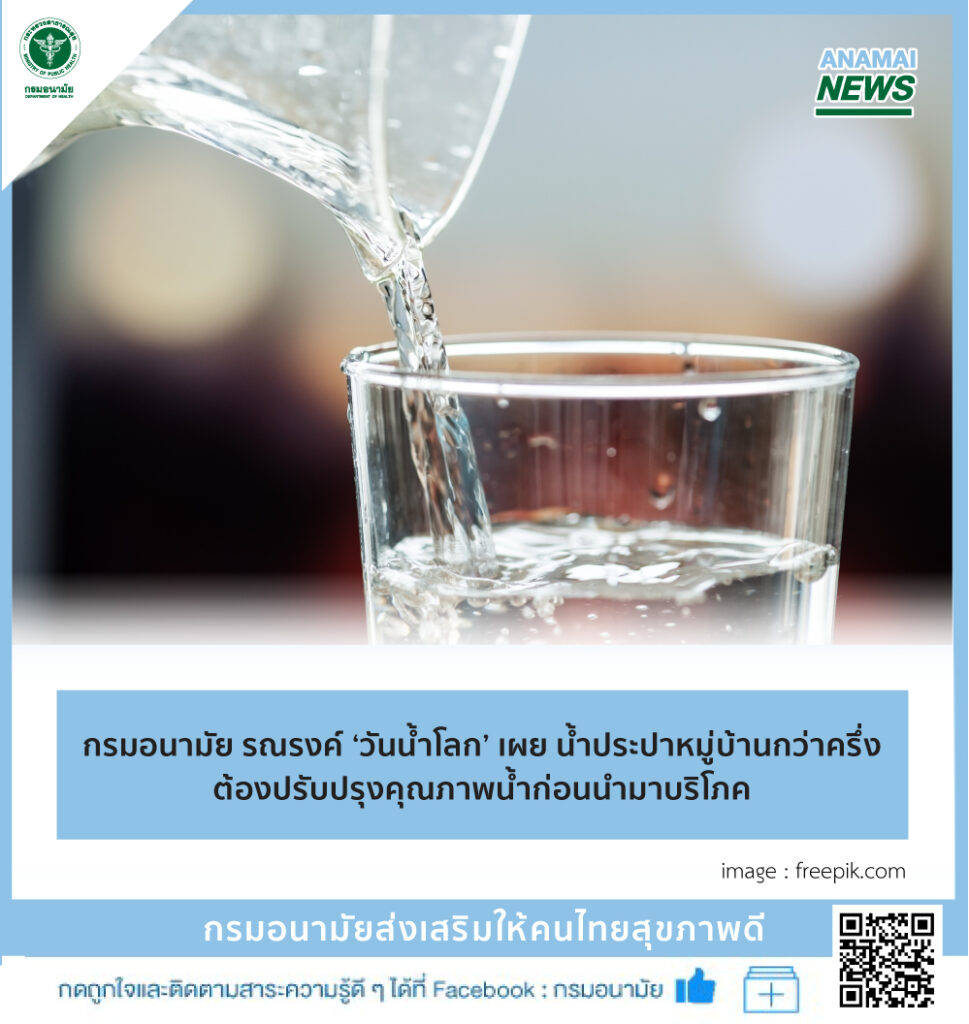 นายแพทย์สุวรรณชัย วัฒนายิ่งเจริญชัย อธิบดีกรมอนามัย กล่าวว่า องค์การสหประชาชาติ (UN) ได้ประกาศให้วันที่ 22 มีนาคมของทุกปีเป็น “วันน้ำโลก” หรือ “World Day for Water” เพื่อกระตุ้นให้ประชากรทั่วโลกเห็นความสำคัญของน้ำ เกิดความตื่นตัวเรื่องการอนุรักษ์น้ำ และการพัฒนาแหล่งน้ำอย่างยั่งยืน โดยกรมอนามัยได้ส่งเสริมให้มีการจัดการคุณภาพน้ำบริโภคให้ได้มาตรฐาน เพื่อคุ้มครอง สุขภาพอนามัยของประชาชน ซึ่งจากการเฝ้าระวังคุณภาพน้ำประปาหมู่บ้านพบว่า มีคุณภาพเหมาะสม สำหรับบริโภคเพียงร้อยละ 20 ร้อยละ 55 ต้องปรับปรุงก่อนนำมาบริโภค โดยการต้ม หรือเติมคลอรีน เพื่อฆ่าเชื้อโรค เนื่องจากพบการปนเปื้อนแบคทีเรีย ส่วนอีกร้อยละ 25 นั้น ไม่สามารถนำมาบริโภคได้ เพราะมีเหล็ก แมงกานีส ฟลูออไรด์ ความกระด้าง และคลอไรด์ เกินเกณฑ์มาตรฐานกรมอนามัย ดังนั้น จึงได้ให้ความสำคัญกับการพัฒนาคุณภาพน้ำประปาหมู่บ้าน และได้ขับเคลื่อนแผนแม่บท การบริหารจัดการทรัพยากรน้ำ 20 ปี ด้านที่ 1 การจัดการน้ำอุปโภค บริโภค และได้จัดทำข้อเสนอต่อคณะอนุกรรมการขับเคลื่อนแผนแม่บทการบริหารจัดการทรัพยากรน้ำ ให้มีคณะทำงานขับเคลื่อนการพัฒนาระบบประปาหมู่บ้านระดับจังหวัด