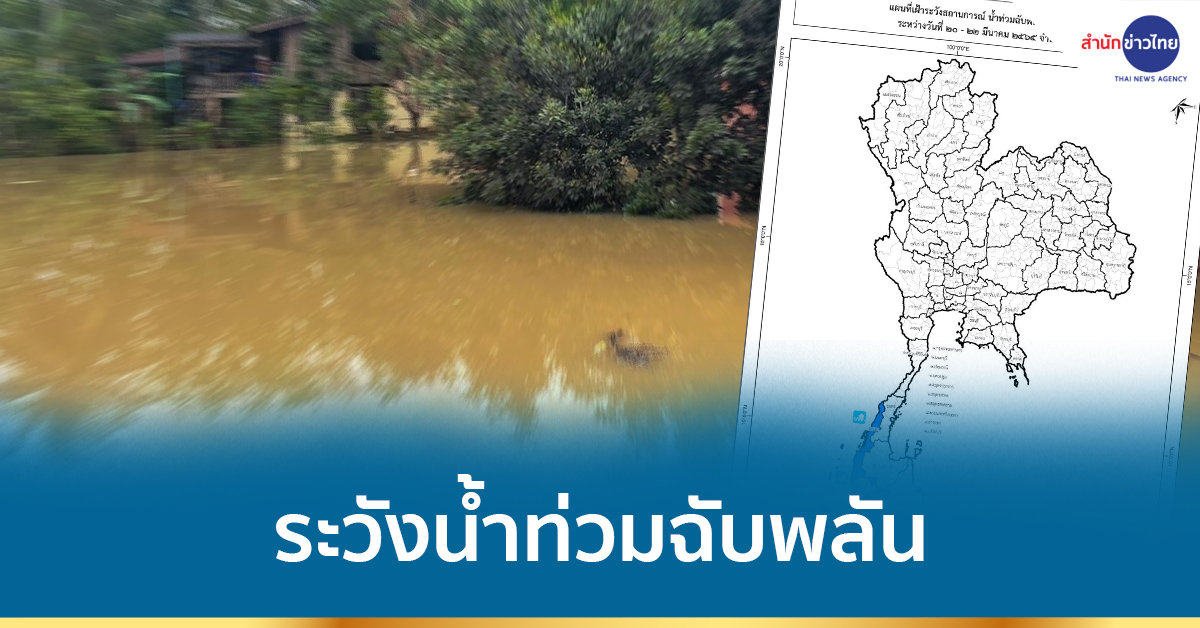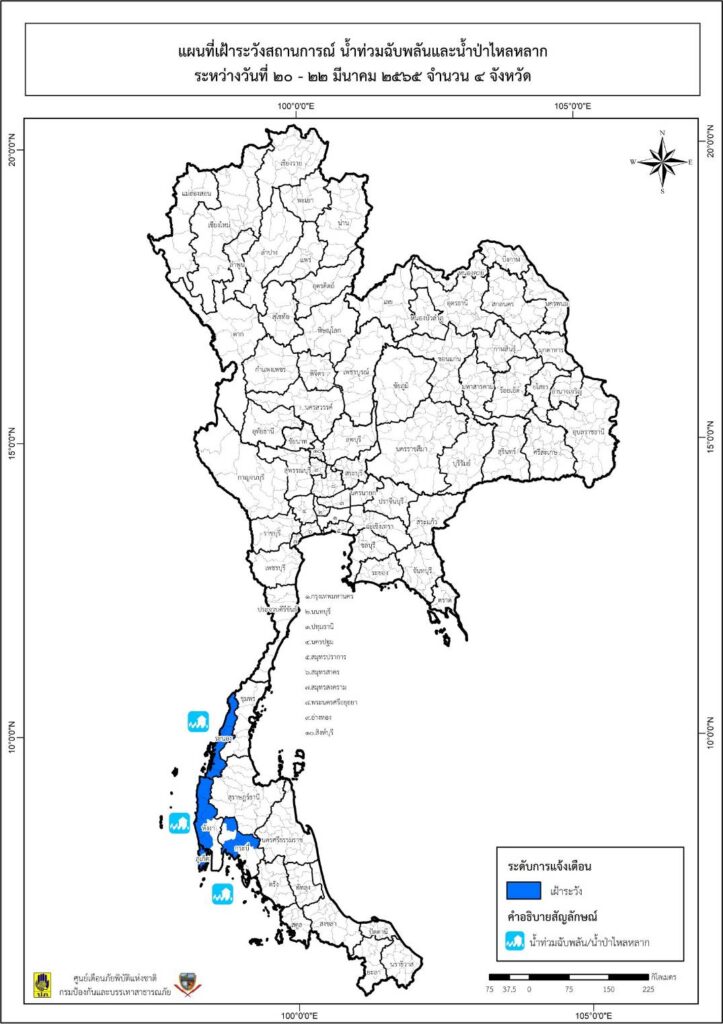 กทม. 20 มี.ค.- ปภ. แจ้งเตือน 4 จังหวัดภาคใต้ เฝ้าระวังสถานการณ์น้ำท่วมฉับพลัน และน้ำป่าไหลหลาก ช่วงวันที่ 20-22 มีนาคม 2565