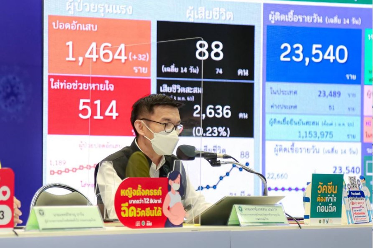 นพ.เฉวตสรร นามวาท ผอ.กองควบคุมโรคและภัยสุขภาพในภาวะฉุกเฉิน กรมควบคุมโรค กล่าวถึงสถานการณ์โควิด-19 ว่า วันนี้ (21 มี.ค.) พบผู้ป่วยติดเชื้อ 23,540 คน ในจำนวนนี้ป่วยหนัก 1,464 คน ใส่ท่อช่วยหายใจ 514 คน รักษาหายป่วย 23,153 คน และเสียชีวิต 88 คน ซึ่งหากดูจำนวนผู้เสียชีวิตจะพบเป็นชาย 44 คน หญิง 44 คน ในจำนวนนี้ 98% เป็นกลุ่มคน 608 และในจำนวนผู้เสียชีวิต 46 คน คิดเป็น 52% ไม่ได้รับวัคซีน และมี 7 คน ที่รับวัคซีนแค่เข็มเดียว ส่วนอีก 29 คน รับวัคซีน 2 เข็มแล้ว แต่เกิน 3 เดือน โดยอายุเฉลี่ยของผู้เสียชีวิตอยู่ที่ 73 ปี และจากการเก็บข้อมูลผู้เสียชีวิต ตั้งแต่ 1 ม.ค.-19 มี.ค.65 พบว่ามีผู้เสียชีวิตรวม 2,464 คน ในจำนวนนี้เป็นหญิงตั้งครรภ์ 2 คน และเป็นผู้ที่มีโรคประจำตัวถึง 2,135 คน ไม่มีโรคประจำตัว 90 คน และไม่ระบุ 239 คน ซึ่งโรคประจำตัวที่พบมากที่สุด คือ ความดันโลหิตสูง และจากข้อมูลของผู้เสียชีวิต พบว่าส่วนใหญ่เป็นกลุ่มคนที่มีการสัมผัสใกล้ชิดกับคนติดเชื้อ หรืออยู่ในพื้นที่เสี่ยง อีกทั้งโอไมครอนติดเชื้อได้ง่าย และภาพรวมของผู้เสียชีวิต 57% ไม่ได้รับวัคซีน มีแค่ 31% ที่รับวัคซีนครบ 2 เข็ม