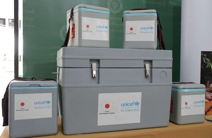นายอนุทิน ชาญวีรกูล รองนายกรัฐมนตรีและรัฐมนตรีว่าการกระทรวงสาธารณสุข ให้สัมภาษณ์ว่า วันนี้ (21 มี.ค.) นายนะชิดะ คะสุยะ เอกอัครราชทูตวิสามัญผู้มีอำนาจเต็มแห่งญี่ปุ่นประจำราชอาณาจักรไทย พร้อมด้วยนางคยองซัน คิม ผู้อำนวยการองค์การยูนิเซฟ ประเทศไทย ได้สนับสนุนหีบเย็น 1,720 ใบ กระติกวัคซีน 1,000 ใบ และอุปกรณ์วัดและบันทึกอุณหภูมิอย่างต่อเนื่อง 1,000 ชิ้น เพื่อบรรจุและรักษาความเย็นวัคซีนในการนำไปฉีดให้กับประชาชน ซึ่งสอดคล้องกับภารกิจที่กระทรวงสาธารณสุขกำลังเร่งรัดดำเนินการในช่วงนี้ คือ การนำวัคซีนไปฉีดให้กับผู้สูงอายุ ผู้ป่วยติดเตียง และประชาชนที่อยู่ในพื้นที่ต่าง ๆ