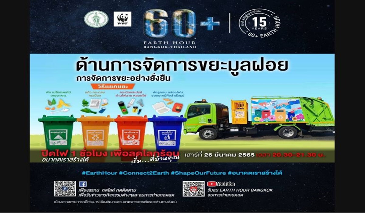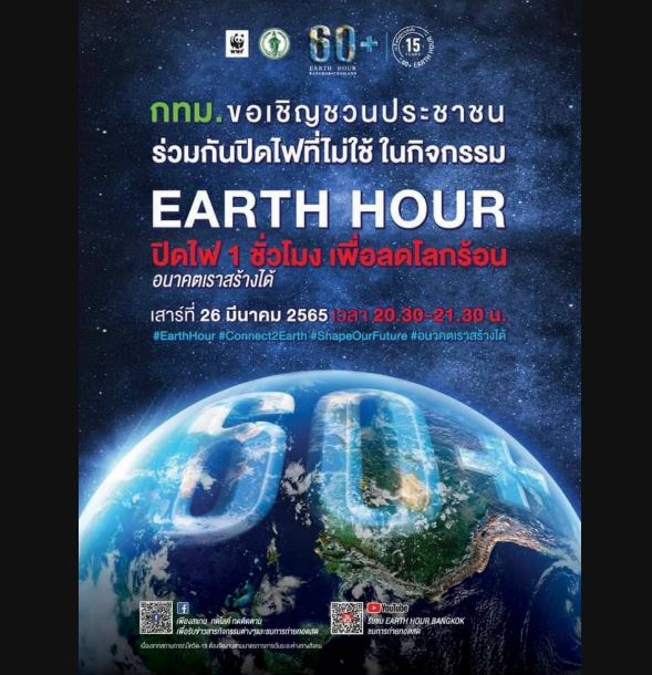 พล.ต.อ.อัศวิน ขวัญเมือง ผู้ว่าฯ กทม. เปิดเผยว่า ตามที่กรุงเทพมหานคร ได้ร่วมกับกองทุนสัตว์ป่าโลก (World Wildlife Fund : WWF) ประเทศไทย และภาคีเครือข่าย จัดกิจกรรมปิดไฟ 1 ชั่วโมง เพื่อลดโลกร้อน มาอย่างต่อเนื่องตั้งแต่ปี 2551 จนถึงปัจจุบัน เพื่อกระตุ้นให้ทุกภาคส่วนรวมถึงประชาชน เห็นความสำคัญของปัญหาภาวะโลกร้อน ด้วยการรณรงค์ให้ผู้ประกอบการ และอาคารบ้านเรือนร่วมกันปิดไฟดวงที่ไม่จำเป็น เป็นเวลา 1 ชั่วโมง โดยในปีนี้กำหนดจัดกิจกรรม “ปิดไฟ 1 ชั่วโมง เพื่อลดโลกร้อน (60+ Earth Hour 2022)” ในวันเสาร์ที่ 26 มีนาคม 2565 ณ บริเวณสกายวอล์คช่องนนทรี เขตสาทร พร้อมรณรงค์และเชิญชวนประชาชน บริษัท ห้างร้าน ผู้ประกอบการ และร้านค้า ลดการใช้พลังงานและปิดไฟที่ไม่จำเป็น เช่น ไฟประดับ ไฟอาคาร ป้ายโฆษณา การถอดปลั๊กเครื่องใช้ไฟฟ้าที่ไม่ใช้งาน ลดการใช้เครื่องปรับอากาศในอาคารบ้านเรือน เป็นเวลา 1 ชั่วโมง พร้อมกับเมืองต่าง ๆ กว่า 190 ประเทศทั่วโลก ตั้งแต่เวลา 20.30-21.30 น. พร้อมแชร์การมีส่วนร่วมในกิจกรรม ด้วยการติดแฮชแท็ก คำว่า #EarthHour #Connect2Earth #ShapeOurFuture #อนาคตเราสร้างได้ เพื่อเป็นการแสดงพลังให้รับรู้ถึงความตั้งใจของประเทศไทยในการช่วยลดปัญหาภาวะโลกร้อนอย่างยั่งยืน และใช้พลังงานอย่างมีประสิทธิภาพอย่างต่อเนื่อง