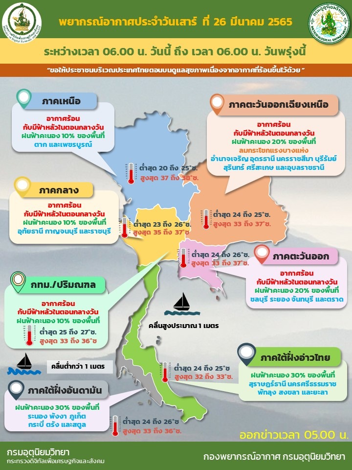 อนึ่ง ในช่วงวันที่ 27 – 28 มี.ค. 65 บริเวณความกดอากาศสูงกำลังปานกลางจากประเทศจีนจะแผ่ลงมาปกคลุมประเทศไทยตอนบนและทะเลจีนใต้ ในขณะที่ประเทศไทยตอนบนมีอากาศร้อน ทำให้บริเวณดังกล่าวมีพายุฤดูร้อนเกิดขึ้น โดยในวันที่ 27 มี.ค. 65 จะเริ่มบริเวณภาคตะวันออกเฉียงเหนือก่อน ส่วนภาคตะวันออก ภาคกลาง และภาคเหนือจะได้รับผลกระทบในวันที่ 28 มี.ค. 65 ซึ่งมีลักษณะของพายุฝนฟ้าคะนอง ลมกระโชกแรง และลูกเห็บตกบางแห่ง รวมถึงฟ้าผ่าที่อาจเกิดขึ้นได้บางพื้นที่ ขอให้ประชาชนบริเวณประเทศไทยตอนบนระวังอันตรายจากพายุฝนฟ้าคะนอง ลมกระโชกแรง และลูกเห็บตกบางแห่ง รวมถึงฟ้าผ่าที่อาจจะเกิดขึ้นได้ โดยหลีกเลี่ยงการอยู่ในที่โล่งแจ้ง ใต้ต้นไม้ใหญ่ ป้ายโฆษณาและสิ่งปลูกสร้างที่ไม่แข็งแรง สำหรับเกษตรกรควรเตรียมการป้องกันและระวังความเสียหายที่จะเกิดต่อผลผลิตทางการเกษตรไว้ด้วย