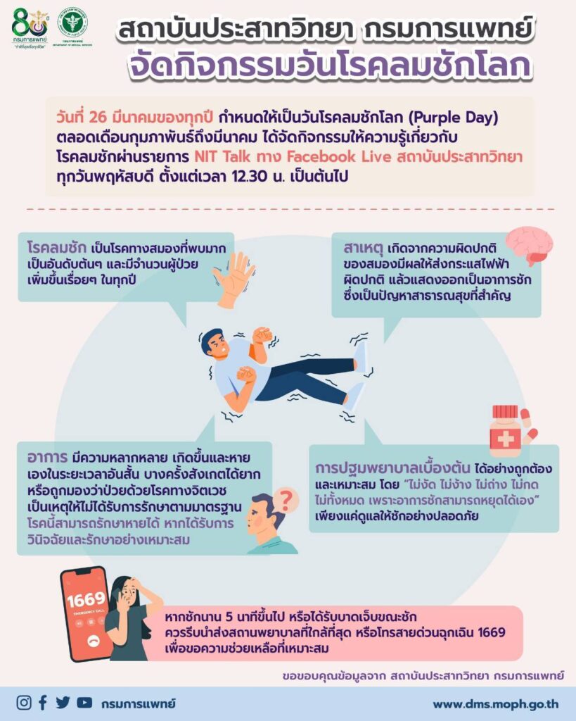 “วันโรคลมชักโลก” หนึ่งวันสำคัญที่ไม่อยากให้ลืม โดยสถาบันประสาทวิทยา กรมการแพทย์ ได้จัดกิจกรรมวันโรคลมชักขึ้นทุกปี และในโอกาสที่ปีนี้ ครบการก่อนตั้ง 80ปี กรมการแพทย์ ทำดีที่สุดเพื่อทุกชีวิต สถาบันประสาทวิทยา จึงได้จัดกิจกรรม “วันโรคลมชัก” เพื่อให้ความรู้ความเข้าใจแก่ประชาชนโดยบุคลากรผู้เชี่ยวชาญด้านโรคลมชัก ตลอดเดือนกุมภาพันธ์ถึงมีนาคม ผ่านรายการ NIT Talk ทาง Facebook Live สถาบันประสาทวิทยา อาทิเช่น โรคลมชักรักษาได้ การประเมินผ่าตัดลมชัก การปฐมพยาบาล ความรู้เรื่องยากันชัก และเวทีสัมมนา 360 องศา ประสบการณ์ชีวิตผู้ป่วยโรคลมชัก ทุกวันพฤหัสบดี ตั้งแต่เวลา 12.30 น. เป็นต้นไป .-สำนักข่าวไทย