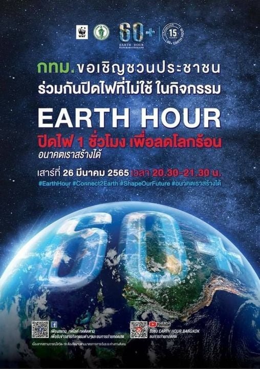 สำหรับปีนี้ 2565 กรุงเทพมหานคร ร่วมกับ WWF ประเทศไทย และภาคีเครือข่าย จัดกิจกรรม “ปิดไฟ 1 ชั่วโมง เพื่อลดโลกร้อน” มีขึ้นในคืนวันนี้(เสาร์ที่ 26 มีนาคม 2565 )ด้วยการรณรงค์ผู้ประกอบการ ร้านค้า และประชาชนลดการใช้พลังงานและปิดไฟที่ไม่จำเป็น เช่น ไฟประดับ ไฟอาคาร ป้ายโฆษณา การถอดปลั๊กเครื่องใช้ไฟฟ้าที่ไม่ใช้งานลดการใช้เครื่องปรับอากาศ ในอาคารบ้านเรือน เป็นเวลา 1 ชั่วโมง ตั้งแต่เวลา 20.30 – 21.30 น. โดยเชิญชวนร่วมแชร์การมีส่วนร่วมกิจกรรม ด้วยการติดแฮชแท็ก คำว่า #EarthHour #Connect2Earth #ShapeOurFuture #อนาคตเราสร้างได้ และยังคงเดินหน้าลดภาวะโลกร้อนใน 4 ด้าน ข้างต้นต่อเนื่อง และมีการประกาศเจตจำนง (Letter of Intent) ร่วมกันขององค์กรเครือข่ายที่มีเป้าหมายดำเนินการแก้ไขปัญหาสิ่งแวดล้อม 4 ด้าน ได้แก่ การไฟฟ้าฝ่ายผลิตแห่งประเทศไทย, การไฟฟ้านครหลวง, การไฟฟ้าส่วนภูมิภาค, การประปานครหลวง, กลุ่มเซ็นทรัล, บริษัท ระบบขนส่งมวลชนกรุงเทพ จำกัด (มหาชน) (BTS) , เดอะมอลล์ กรุ๊ป , นิติบุคคลอาคารชุด ดิ เอ็มโพริโอ เพลส, กลุ่มบริษัท แคนนอน ประเทศไทย, บริษัท บางจาก คอร์ปอเรชั่น จำกัด (มหาชน), FEED ประเทศไทย , มหาวิทยาลัยเทคโนโลยีพระจอมเกล้าธนบุรี , บริษัท ไทยวาโก้ จำกัด (มหาชน) , บริษัท ทรู คอร์ปอเรชั่น จำกัด บริษัท ซีพี ออลล์ จำกัด (มหาชน) กองบัญชาการกองทัพไทย บริษัท แอสเสท เวิรด์ คอร์ป จำกัด (มหาชน) และกรมส่งเสริมคุณภาพสิ่งแวดล้อม