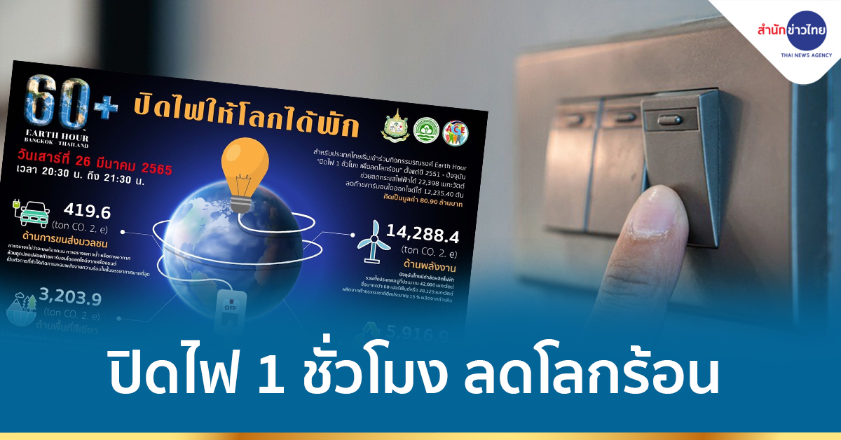 กทม. 26 มี.ค.- ชวนคนไทยรวมพลัง “ปิดไฟ 1 ชั่วโมง เพื่อลดโลกร้อน (60 Earth Hour)” 20.30 – 21.30 น. คืนนี้