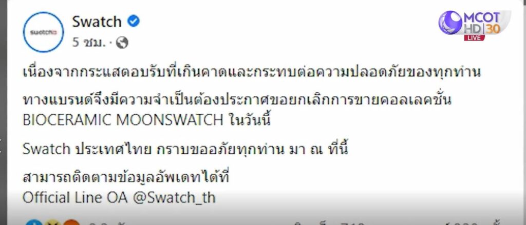จากนั้นประมาณ 09.40น. เพจเฟซบุ๊ก WATCH จึงประกาศยกเลิกการขายคอลเลกชัน BIOCERAMIC MOONSWATCH ในวันนี้ โดยระบุว่า “เนื่องจากกระแสตอบรับที่เกินคาดและกระทบต่อความปลอดภัยของทุกท่าน ทางแบรนด์จึงมีความจำเป็นต้องประกาศขอยกเลิกการขายคอลเลกชัน BIOCERAMIC MOONSWATCH ในวันนี้ Swatch ประเทศไทย กราบขออภัยทุกท่าน มา ณ ที่นี้”