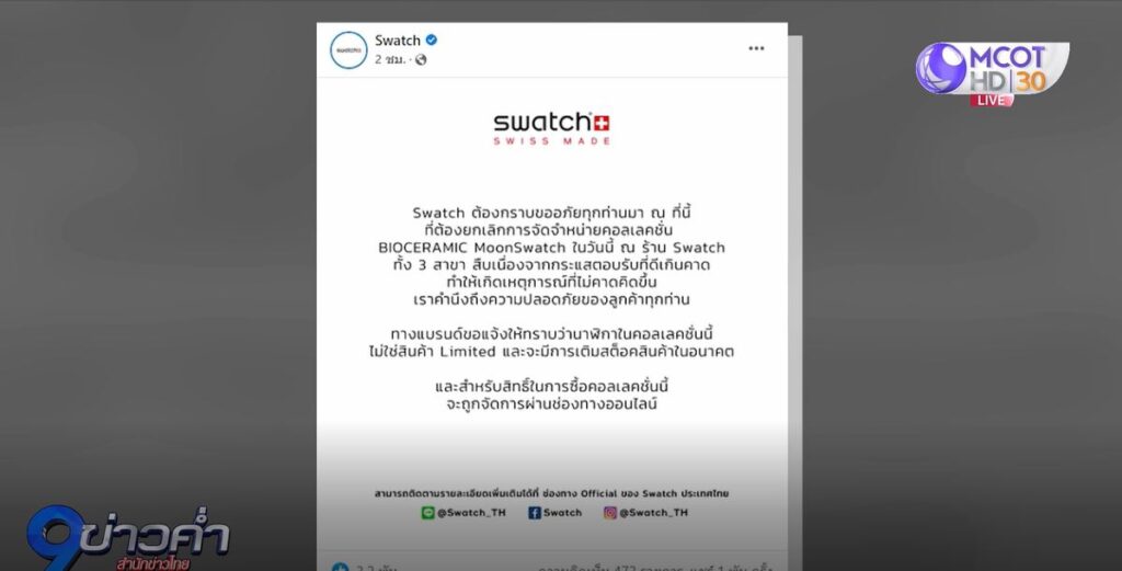 กรุงเทพฯ 26 มี.ค. – Swatch ประกาศยกเลิกขายนาฬิกา Omega x Swatch คอลเลกชัน BIOCERAMIC MOONSWATCH หลังคนรอคิวแน่นจนเกิดเหตุชุลมุนหน้าห้างดัง แจงไม่ใช่สินค้าลิมิเต็ด พร้อมประกาศสิทธิในการซื้อคอลเลกชันนี้จะถูกจัดการผ่านออนไลน์เท่านั้น