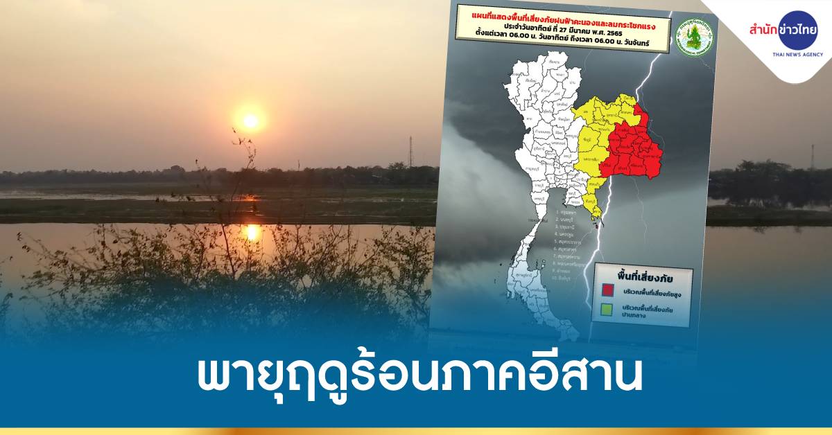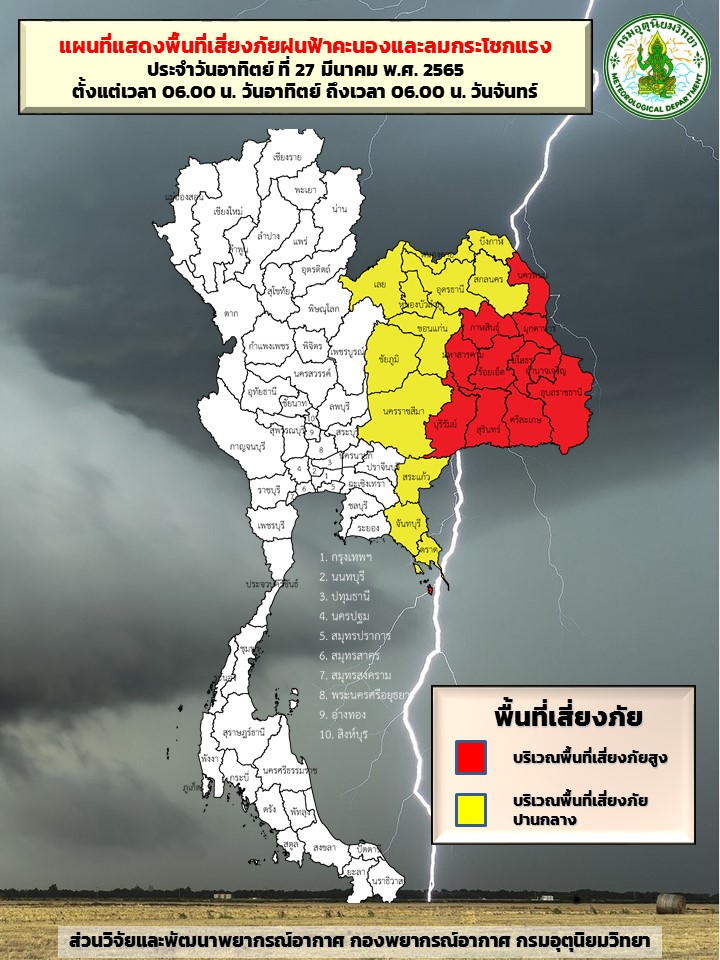 กรมอุตุนิยมวิทยา พยากรณ์อากาศ 24 ชั่วโมงข้างหน้า บริเวณความกดอากาศสูง หรือมวลอากาศเย็นกำลังปานกลางจากประเทศจีนแผ่ปกคลุมตอนใต้ของประเทศจีนและประเทศเวียดนามตอนบนแล้ว คาดว่าจะแผ่ลงมาปกคลุมภาคตะวันออกเฉียงเหนือและทะเลจีนใต้ในวันนี้ (27 มี.ค.65) ในขณะที่ประเทศไทยตอนบนมีอากาศร้อน ทำให้บริเวณดังกล่าวมีพายุฤดูร้อนเกิดขึ้น โดยจะเริ่มบริเวณภาคตะวันออกเฉียงเหนือก่อน ส่วนภาคเหนือ ภาคกลาง และภาคตะวันออก จะได้รับผลกระทบในวันพรุ่งนี้ (28 มี.ค.65) ซึ่งมีลักษณะของพายุฝนฟ้าคะนอง ลมกระโชกแรง และลูกเห็บตกบางแห่ง รวมถึงฟ้าผ่าที่อาจเกิดขึ้นได้บางพื้นที่ ขอให้ประชาชนในบริเวณดังกล่าวระวังอันตรายจากพายุฝนฟ้าคะนอง ลมกระโชกแรง และลูกเห็บตกบางแห่ง รวมถึงฟ้าผ่าที่อาจจะเกิดขึ้นได้ โดยหลีกเลี่ยงการอยู่ในที่โล่งแจ้ง ใต้ต้นไม้ใหญ่ ป้ายโฆษณาและสิ่งปลูกสร้างที่ไม่แข็งแรง สำหรับเกษตรกรควรเตรียมการป้องกันและระวังความเสียหายที่จะเกิดต่อผลผลิตทางการเกษตรไว้ด้วย