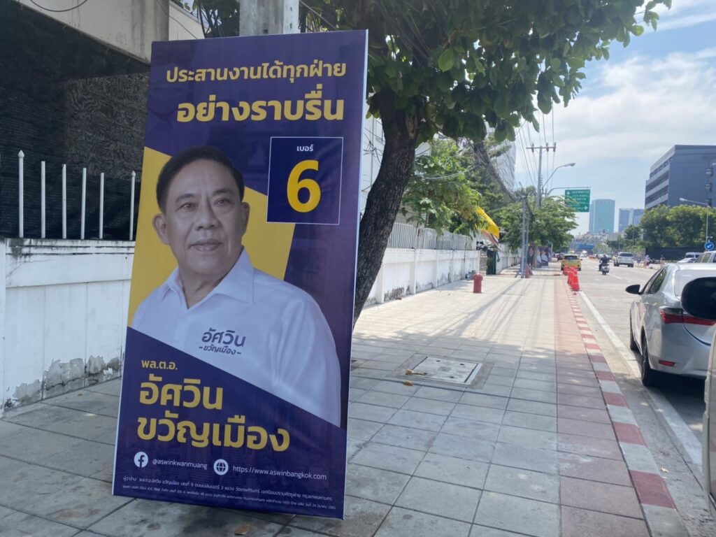 ขณะที่จากการสังเกตป้ายของผู้สมัครผู้ว่าฯ กทม.หลายคน โดยส่วนใหญ่เป็นขนาดที่ กกต.กำหนด คือ ขนาดกว้าง 130 เซนติเมตร (1.30 เมตร) ยาว 245 เซนติเมตร (2.45 เมตร) บนป้ายปรากฏภาพผู้สมัคร พร้อมเบอร์ และสโลแกน โดยป้ายแต่ละคนใช้สีที่โดดเด่นตามสีเอกลักษณ์ของพรรค หรือสีหลักที่ใช้หาเสียงเพื่อให้เป็นที่จดจำ ดึงดูดสายตา เช่น ป้ายของ เบอร์ 6 พล.ต.อ.อัศวิน ขวัญเมือง เน้นภาพดูยิ้มเป็นมิตร สวมเสื้อเชิ้ตแบบสบาย ๆ พร้อม#ทีมอัศวิน สีหลักที่ใช้บนป้าย คือ น้ำเงิน เหลือง