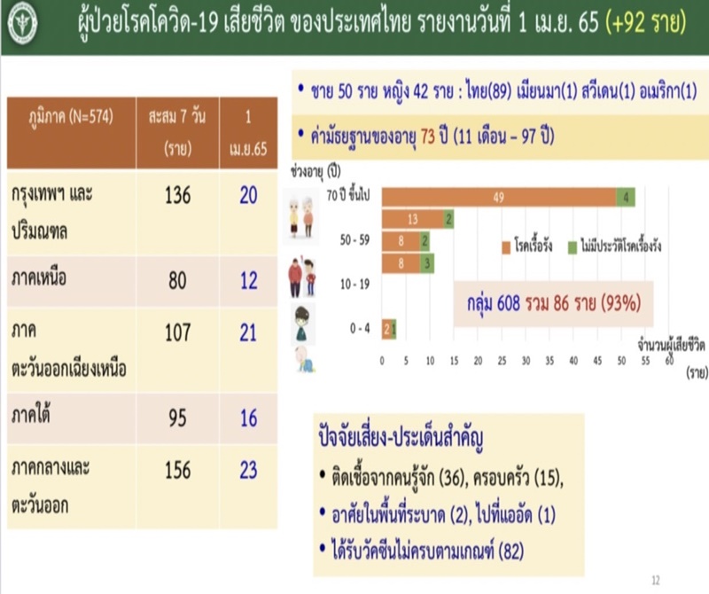 นพ.สมศักดิ์ อรรฆศิลป์ อธิบดีกรมการแพทย์ กล่าวถึงสถานการณ์การติดเชื้อโควิด-19 ที่พบผู้เสียชีวิตสูงสุด 92 คน ในวันนี้ (1 เม.ย.) ว่า คาดว่าประชาชนอาจมีความวิตกกังวลกับตัวเลขผู้เสียชีวิตวันนี้ โดยยอมรับว่าสถานการณ์การติดเชื้อมีแนวโน้มเพิ่มมากขึ้น และส่วนตัวเชื่อว่าการตรวจหาเชื้อด้วย ATK สูงกว่าการตรวจด้วยวิธี RT-PCR และในตัวเลขผู้ป่วยติดเชื้อพบว่าผู้ป่วยใส่ท่อช่วยหายใจ และผู้ป่วยอาการหนักก็มีการปรับเพิ่มสูงขึ้น เมื่อดูสัดส่วนของผู้เสียชีวิตวันนี้ พบว่า 93% เป็นกลุ่มผู้ป่วยติดเชื้อ 608