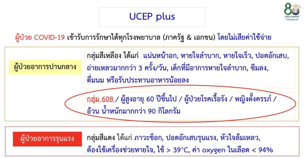 อย่างไรก็ตาม ขอย้ำว่าผู้ป่วย 608 ถือว่าเข้าข่ายเกณฑ์สีเหลืองเหมือน Ucep Plus สามารถเข้ารับการรักษาและนอน รพ.ได้ทุกที่ โดยต้องไม่มีการปฏิเสธผู้ป่วย และเตรียมขยายเตียงผู้ป่วยระดับ 2.1-3 เพิ่มมากขึ้น เพื่อสอดรับกับสถานการณ์ปัจจุบัน ซึ่งสัญญาณการขยายเตียงจะดูที่หากความหนาแน่นของเตียงเกิน 80% เพื่อไม่ให้การขยายเตียงกระทบกับผู้ป่วยโรคอื่น ๆ ที่อาจถูกเลื่อนการรักษา