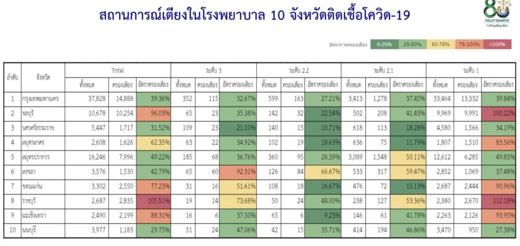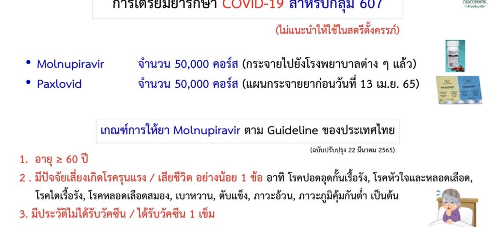 นพ.สมศักดิ์ กล่าวว่า สำหรับสถานการณ์เตียง เมื่อดูเป็นรายจังหวัดพบว่ามีความหนาแน่นบางพื้นที่ โดยใน 10 จังหวัดที่มีการติดเชื้อมากที่สุด พบว่ามีแค่ จ.สงขลา สถานการณ์เตียงอยู่ภาวะสีเหลืองเกือบทุกระดับ พร้อมกันนี้ยังย้ำว่า นายกรัฐมนตรีได้กำชับให้ดูแลคนกลุ่ม 608 ให้ได้รักษาใน รพ. เนื่องจากเข้าใจสถานการณ์โรคที่พบว่ากลุ่มคนเหล่านี้เสี่ยงติดเชื้อแล้วมีอาการรุนแรง ส่วนการจ่ายยานั้น ได้มีกระจายยาโมลนูพิราเวียร์และแพกซ์โลวิดแล้ว คาดว่ามีพร้อมใช้ก่อนเทศกาลสงรานต์ สำหรับข้อชี้ในการใช้ยาโมลนูพิราเวียร์ จะใช้ในกลุ่มคน 607 ยกเว้นหญิงตั้งครรภ์ และยังใช้ค่า BMI เป็นเกณฑ์ในการจ่ายยาอีกด้วย