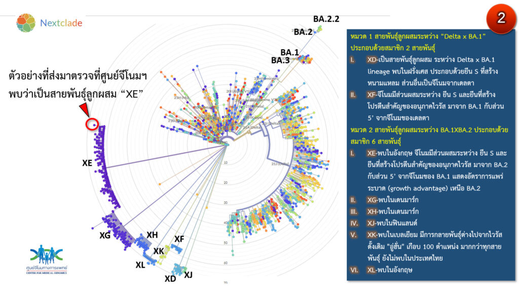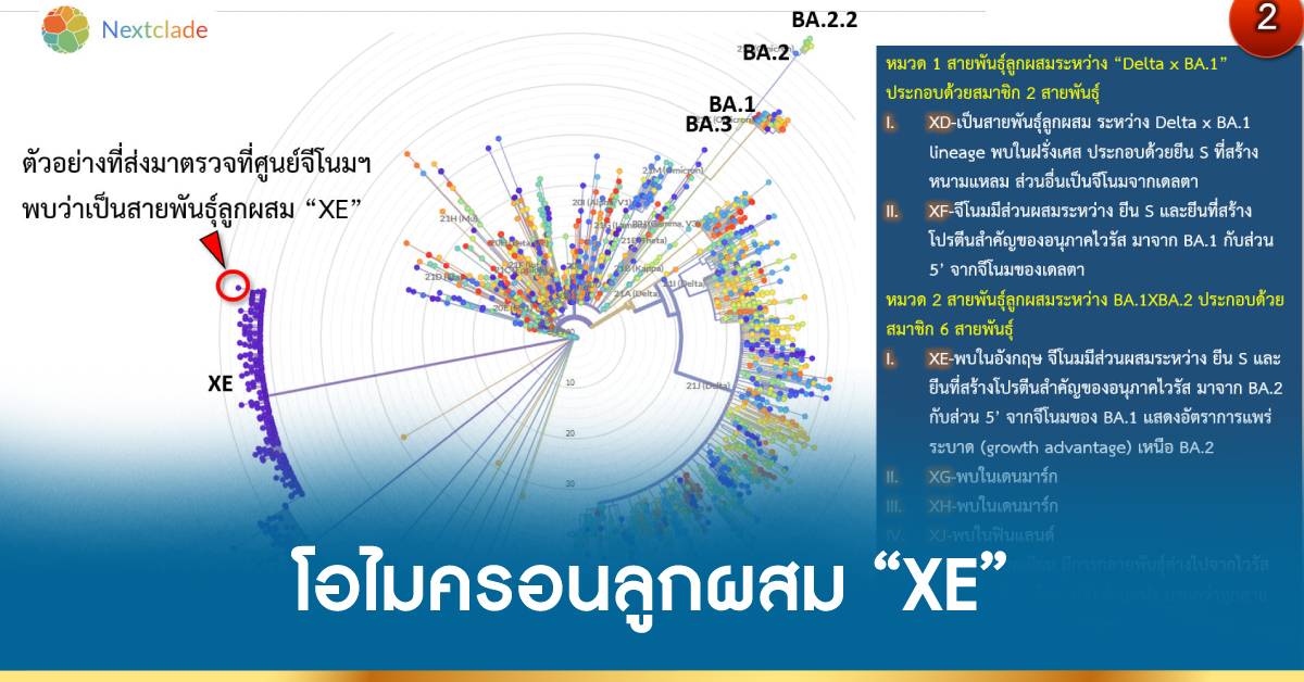 I. XE-พบในอังกฤษ จีโนมมีส่วนผสมระหว่าง ยีน S และยีนที่สร้างโปรตีนสำคัญของอนุภาคไวรัส มาจาก BA.2 กับส่วน 5’ จากจีโนมของ BA.1 แสดงอัตราการแพร่ระบาด (growth advantage) เหนือ BA.2 ศูนย์จีโนมทางการแพทย์ รพ.รามาธิบดี ถอดรหัสพันธุกรรมพบแล้ว 1 ราย