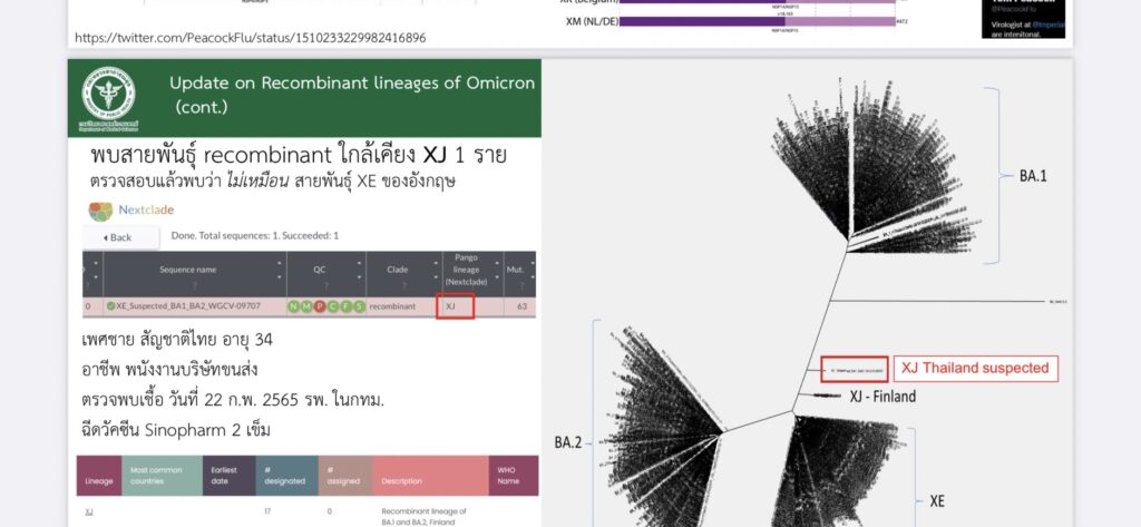 สธ. 4 เม.ย.- กรมวิทย์ฯ เผยพบโควิดลูกผสม XJ เป็นการรวมระหว่าง BA.1 +BA.2 ส่งรายงาน GISAID แล้ว เป็นชายไทย 34 ปี อาชีพส่งของ รับวัคซีนซิโนฟาร์ม 2 เข็มปัจจุบันหายแล้ว การพบลูกผสมตระกูล X เกิดขึ้นตามธรรมชาติของไวรัส ทั่วโลกพบ 17 ตัว ส่วนของรามาธิบดีพบลูกผสม XE
