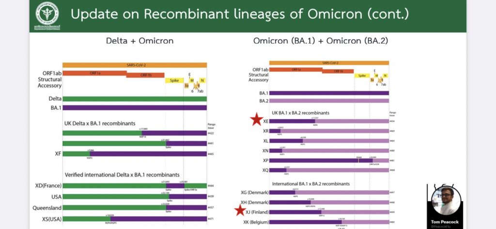 นพ.ศุภกิจ ศิริลักษณ์ อธิบดีกรมวิทยาศาสตร์การแพทย์ กล่าวว่า หลังจากที่ รพ.รามาธิบดี เผยว่า ผลจากการติดตามถอดรหัสพันธุกรรมเชื้อโควิด-19 พบสายพันธุ์ลูกผสมระหว่างสายพันธุ์ย่อย โอไมครอน BA.1 และ BA.2 จนเกิดสายพันธุ์ ลูกผสม XE ที่พบในประเทศอังกฤษ และล่าสุด กรมวิทยาศาสตร์การแพทย์ ได้มีการนำตัวอย่างเชื้อของผู้ป่วยติดเชื้อโอไมครอนมาถอดรหัสพันธุกรรมก็พบสายพันธุ์ลูกผสม XJ ที่พบมากในฟินแลนด์ โดยสายพันธุ์ลูกผสมที่พบของกรมวิทย์ฯ นี้ พบในชายไทย 34 ปี อาชีพพนักงานขนส่งสิ่งของ ซึ่งด้วยอาชีพเจอคนหลากหลาย มีประวัติรับวัคซีนซิโนฟาร์ม 2 เข็ม ทั้งนี้ชายคนดังกล่าวปัจจุบันรักษาหายป่วยแล้ว ส่วนการเกิดสายพันธุ์ลูกผสมตระกูล X คือ การพบคนติดเชื้อมากกว่า 2 สายพันธุ์ในคนเดียว และเกิดการผสมกันระหว่างสายพันธุ์ จนเกิดเป็นไฮบริด หรือ ลูกผสม โดยทั่วโลกพบสายพันธุ์ลูกผสม หรือ ไฮบริด รวม 17 ตัว ทั้งนี้กรมวิทย์ฯ ได้นำเชื้อดังกล่าวที่พบ รายงานต่อ GISAID แล้ว