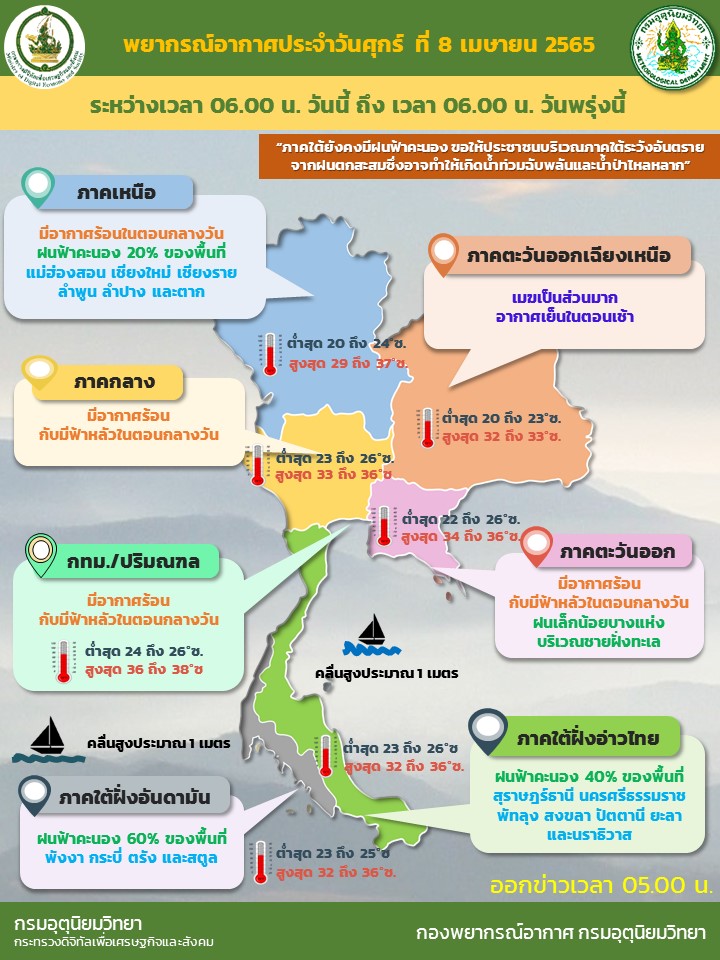 กรมอุตุฯ 8 เม.ย. – กรมอุตุฯ เผยไทยตอนบน รวมทั้งกรุงเทพฯ-ปริมณฑล อากาศร้อน ภาคอีสานอากาศเย็นตอนเช้า ขณะที่ภาคเหนือมีฝนฟ้าคะนองบางพื้นที่ ส่วนภาคใต้ยังคงมีฝนฟ้าคะนอง
