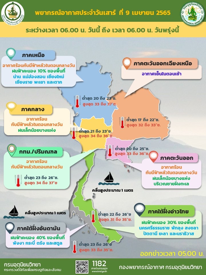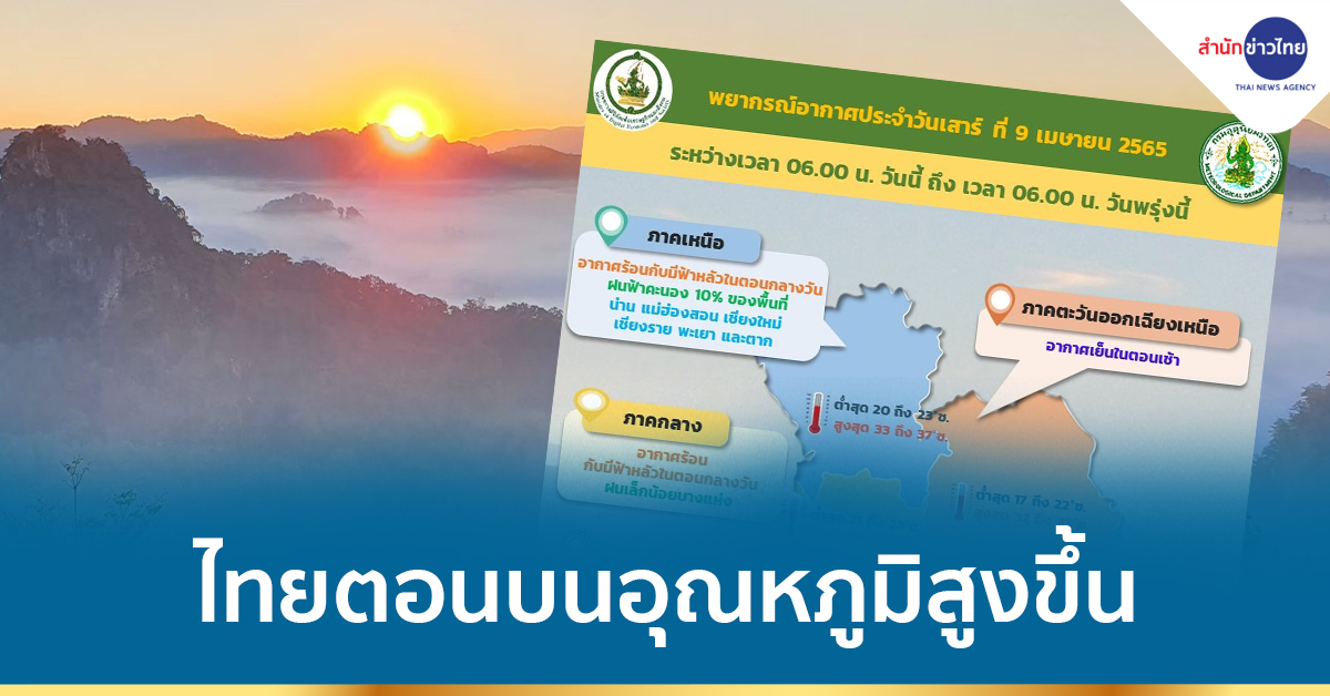 กทม. 9 เม.ย.- กรมอุตุฯ เผยไทยตอนบนมีอุณหภูมิสูงขึ้น ภาคเหนือฝนฟ้าคะนองบางพื้นที่ ส่วนภาคใต้ฝนลดลง ขณะที่กรุงเทพฯ -ปริมณฑล วันนี้อากาศร้อนอุณหภูมิสูงสุด 34-37 องศาฯ