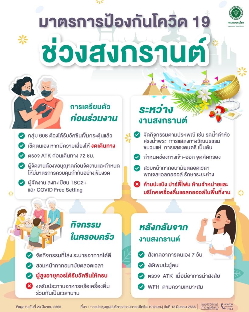 กรมควบคุมโรค กระทรวงสาธารณสุข แนะมาตรการป้องกันโรคโควิด 19 ในช่วงเทศกาลสงกรานต์ โดยเน้นสวมหน้ากาก ล้างมือบ่อยๆ เว้นระยะห่าง และหลีกเลี่ยงไปในที่เสี่ยงต่างๆ ที่มีคนอยู่รวมกันจำนวนมาก และขอให้กลุ่มเสี่ยง 608 โดยเฉพาะผู้สูงอายุ รีบไปฉีดวัคซีนเข็มกระตุ้นโดยเร็ว