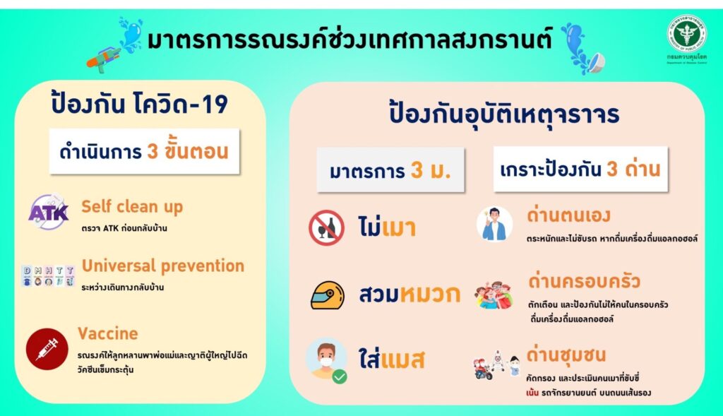 นอกจากนี้ ในช่วงเทศกาลสงกรานต์ จะมีผู้เดินทางจำนวนมากและอาจเกิดอุบัติเหตุได้ จึงขอให้ผู้ขับขี่ยานพาหนะปฏิบัติตามกฎจราจรและกฎหมายควบคุมเครื่องดื่มแอลกอฮอล์ พร้อมทั้งขอให้ประชาชนปฏิบัติตามมาตรการ 3 ม. ได้แก่ ไม่เมา สวมหมวก ใส่แมส ร่วมกับมาตรการเกราะป้องกัน 3 ด่าน ได้แก่ ด่านตนเอง ควรตระหนักหากดื่มเครื่องดื่มแอลกอฮอล์ไม่ควรขับรถ ด่านครอบครัว ตักเตือนและป้องกันไม่ให้คนในครอบครัวดื่มเครื่องดื่มแอลกอฮอล์ และด่านชุมชน คัดกรองและประเมินคนเมาที่ขับขี่ โดยเน้นที่ผู้ขับขี่รถจักรยานยนต์บนถนนสายรอง เพื่อความปลอดภัยในการเดินทางและป้องกันอุบัติเหตุทางถนน สอบถามข้อมูลเพิ่มเติมได้ที่ สายด่วนกรมควบคุมโรค โทร.1422 .-สำนักข่าวไทย