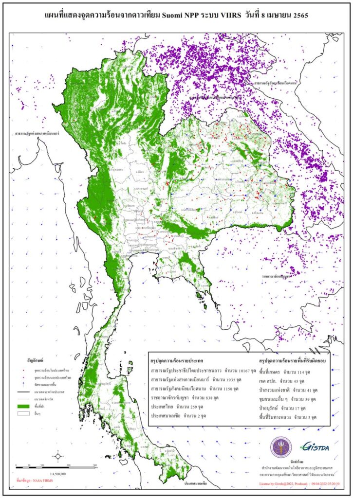 GISTDA เผยข้อมูลจากดาวเทียมซูโอมิ เอ็นพีพี (Suomi NPP) ของระบบเวียร์ (VIIRS) เมื่อวันที่ 8 เมษายน 2565 พบจุดความร้อนทั้งประเทศ 259 จุด พบมากที่สุดในพื้นที่เกษตร 114 จุด พื้นที่เขตสปก. 45 จุด พื้นที่ป่าสงวนแห่งชาติ 41 จุด พื้นที่ชุมชนและอื่นๆ 39 จุด พื้นที่ป่าอนุรักษ์ 17 จุด และพื้นที่ริมทางหลวง 3 จุด ส่วนจังหวัดที่พบจุดความร้อนมากที่สุดคือ สกลนคร 34 จุด อุดรธานี 28 จุด และยโสธร 23 จุด ตามลำดับ จากภาพแสดงให้เห็นจุดความร้อนเกิดขึ้นเล็กน้อยในพื้นที่ภาคกลาง และกระจายตัวเพิ่มขึ้นในพื้นที่ภาคตะวันออกเฉียงเหนือ ส่วนพื้นที่ภาคเหนือยังคงพบจุดความร้อนเล็กน้อย เนื่องจากมีฝนตกในบางพื้นที่ ทั้งนี้ จากการรวบรวมข้อมูลจุดความร้อนตั้งแต่ 1 มกราคม – 8 เมษายน 2565 พบว่าภาคเหนือมีจุดความร้อนแล้ว 13,206 จุด ตามด้วยภาคตะวันออกเฉียงเหนือ 12,455 จุด และภาคกลาง 7,685 จุด ตามลำดับ