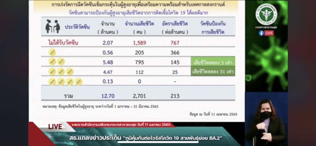 สำนักข่าวไทย 11 เม.ย. – กรมวิทย์ฯ ยันรับวัคซีน 3 เข็ม สร้างภูมิคุ้มกัน ลดความรุนแรง โชว์ผลการศึกษาภูมิคุ้มกันพบว่า BA.2 ไม่หลบภูมิวัคซีน จึงเป็นสาเหตุให้คนติดเชื้อไม่ป่วยหนัก ไม่แสดงอาการ แต่ยังแพร่เชื้อได้ หากรับวัคซีนแค่ 2 เข็ม นานเกิน 1 เดือนต้องรับเข็มกระตุ้น หรือ เข็ม 3