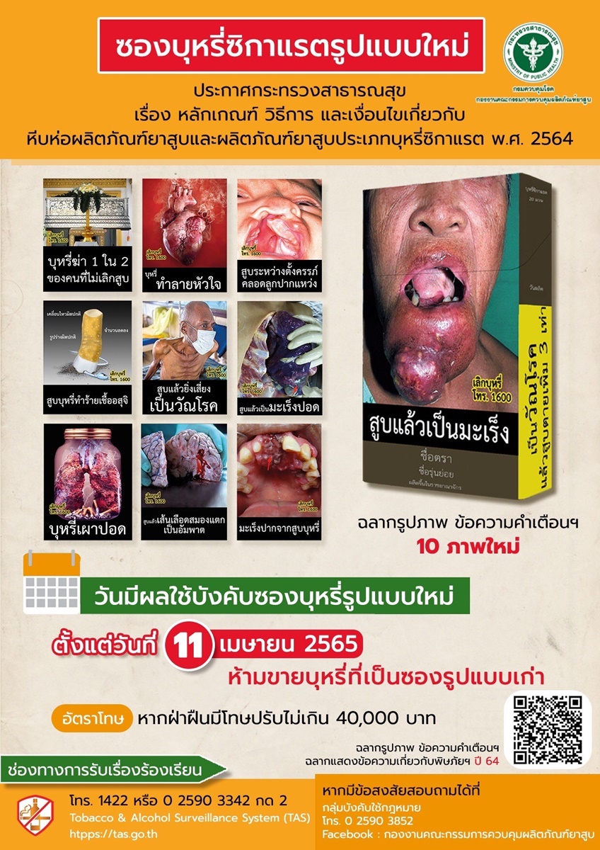นพ.ขจรศักดิ์ แก้วจรัส รองอธิบดีกรมควบคุมโรค กล่าวว่า การลงพื้นที่บังคับใช้กฎหมายครั้งนี้ เพื่อตรวจสอบการปฏิบัติตามประกาศกระทรวงสาธารณสุข เรื่อง หลักเกณฑ์ วิธีการ และเงื่อนไขเกี่ยวกับหีบห่อผลิตภัณฑ์ยาสูบและผลิตภัณฑ์ยาสูบประเภทบุหรี่ซิกาแรต พ.ศ. 2564 (ฉบับใหม่) ซึ่งกำหนดให้ตั้งแต่วันที่ 11 เมษายน 2565 เป็นต้นไป ผู้ผลิตหรือผู้นำเข้าบุหรี่ซิกาแรตเพื่อขายในประเทศไทย ต้องปรับเปลี่ยนซองบุหรี่ซิกาแรตให้มีรูปแบบใหม่ตามที่กฎหมายกำหนดเท่านั้น ซึ่งการปรับเปลี่ยนรูปภาพคำเตือนพิษภัยบุหรี่นั้น จะช่วยลดแรงจูงใจสำหรับนักสูบ อีกทั้งยังเป็นการให้ข้อมูลเชิงสุขศึกษากับประชาชนและนักสูบ ได้ตระหนักถึงโทษและภัยจากการบริโภคผลิตภัณฑ์ยาสูบ