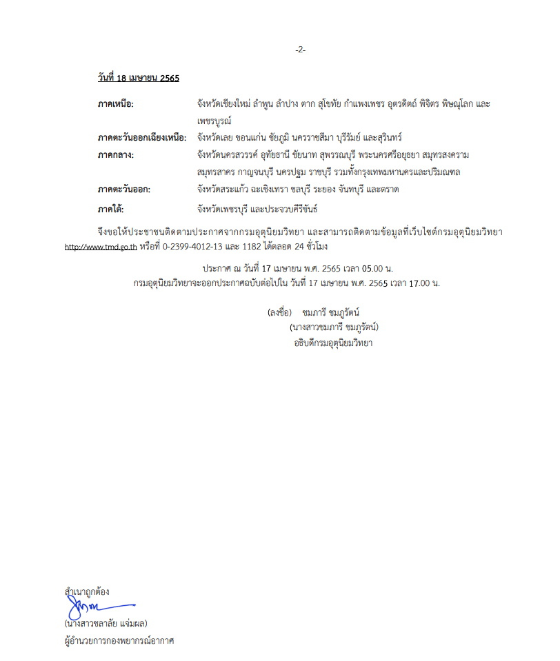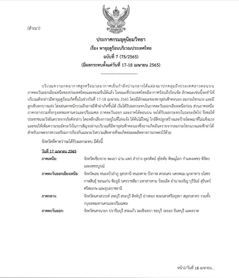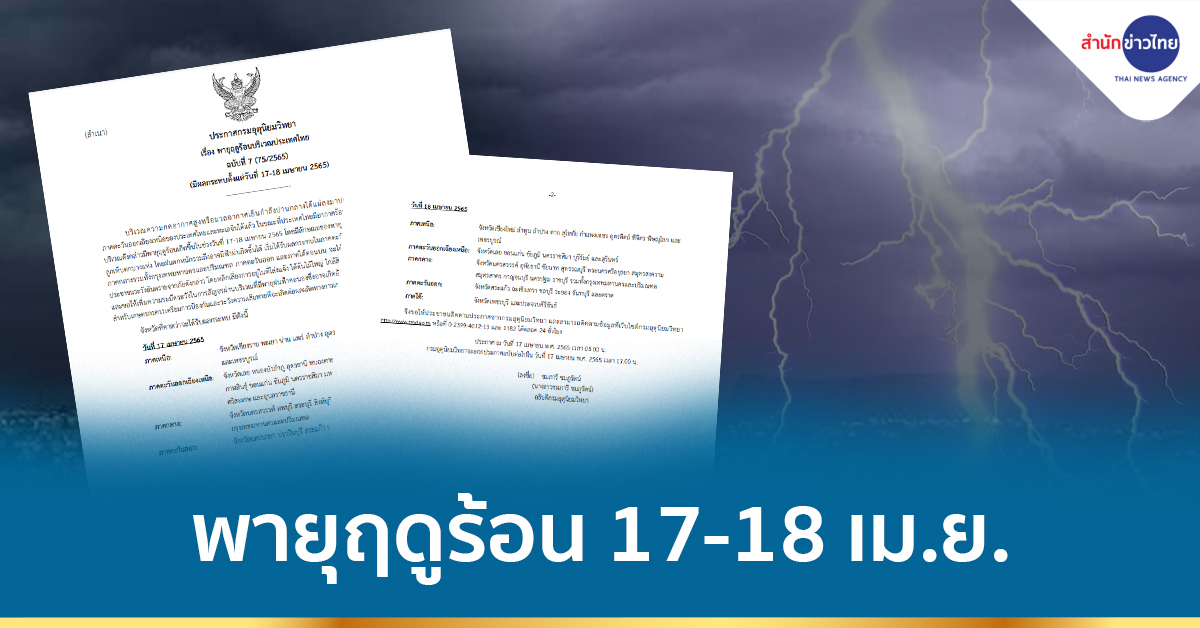 บริเวณความกดอากาศสูงหรือมวลอากาศเย็นกำลังปานกลางได้แผ่ลงมาปกคลุมถึงประเทศลาวตอนบน ภาคตะวันออกเฉียงเหนือของประเทศไทยและทะเลจีนใต้แล้ว ในขณะที่ประเทศไทยมีอากาศร้อนถึงร้อนจัด ลักษณะเช่นนี้จะทำให้บริเวณดังกล่าวมีพายุฤดูร้อนเกิดขึ้นในช่วงวันที่ 17-18 เมษายน 2565 โดยมีลักษณะของพายุฝนฟ้าคะนอง ลมกระโชกแรง และมีลูกเห็บตกบางแห่ง โดยฝนตกหนักรวมถึงอาจมีฟ้าผ่าเกิดขึ้นได้ เริ่มได้รับผลกระทบในภาคตะวันออกเฉียงเหนือก่อน ส่วนภาคเหนือ ภาคกลางรวมทั้งกรุงเทพมหานครและปริมณฑล ภาคตะวันออก และภาคใต้ตอนบน จะได้รับผลกระทบในระยะถัดไป จึงขอให้ประชาชนระวังอันตรายจากภัยดังกล่าว โดยหลีกเลี่ยงการอยู่ในที่โล่งแจ้ง ใต้ต้นไม้ใหญ่ ใกล้สิ่งปลูกสร้างและป้ายโฆษณาที่ไม่แข็งแรง และขอให้เพิ่มความระมัดระวังในการสัญจรผ่านบริเวณที่มีพายุฝนฟ้าคะนองซึ่งอาจเกิดอันตรายจากลมกระโชกแรงและฟ้าผ่าได้ สำหรับเกษตรกรควรเตรียมการป้องกันและระวังความเสียหายที่จะเกิดต่อผลผลิตทางการเกษตรไว้ด้วย จังหวัดที่คาดว่าจะได้รับผลกระทบ มีดังนี้