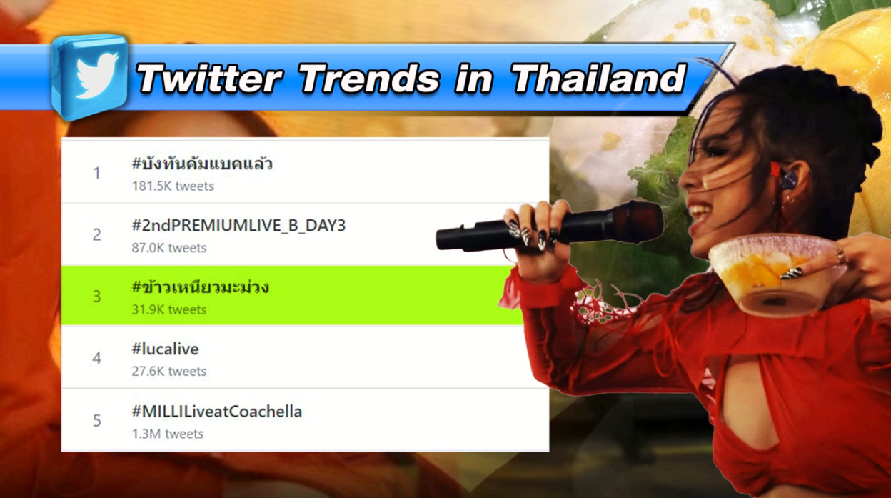 มิลลิ ดนุภา หรือ MILLI แรปเปอร์สาว จากค่าย YUPP ทำให้ต่างชาติได้รู้จักประเทศไทยจากการร้องท่อนแร็ปว่า “ฉันไม่ได้ขี่ช้าง บ้านฉันมีทั้งรถไฟลอยฟ้าและใต้ดิน เสาไฟกินรีต้นละแสนก็มี รถไฟไทยสมัย ร.5 ใช้มาแล้ว 120 ปี” รวมการหยิบเอาข้าวเหนียวมะม่วง เมนูเด็ดของไทยขึ้นไปกินโชว์บนเวทีเลยทีเดียว ทำให้วันนี้แฮชแท็ก #MILLILiveatCoachella ได้พุ่งทะยานขึ้นเป็นอันดับ 1 ในโลกออนไลน์ทันที หลังจากที่เธอได้ขึ้นแสดง และแฮชแท็ก #ข้าวเหนียวมะม่วง ก็ติดอันดับ 3 ในเทรนทวิตเตอร์ในรอบ 24 ชั่วโมงของเมื่อวานนี้