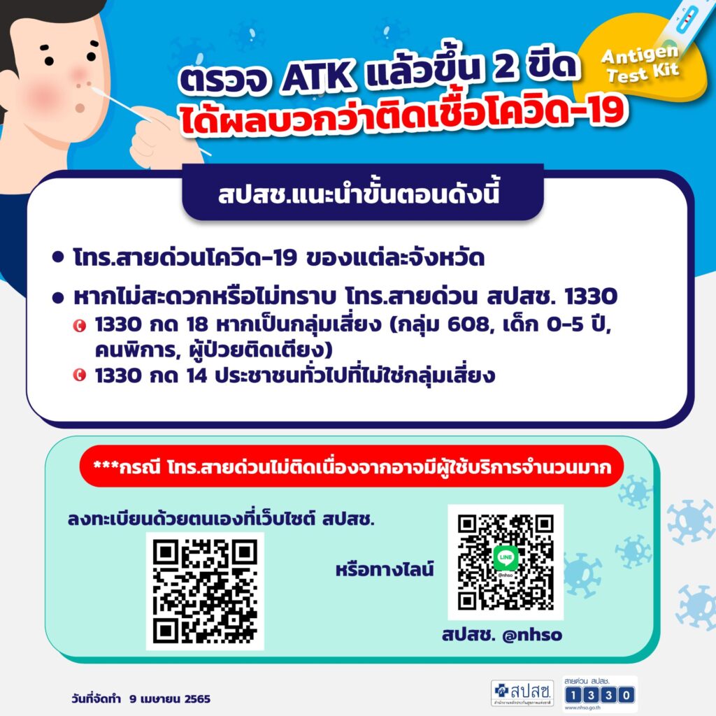 ทั้งนี้ ประชาชนที่ตรวจ ATK แล้วขึ้น 2 ขีด ได้ผลบวกว่าติดเชื้อโควิด-19 แนะนำดังนี้ เพื่อความรวดเร็ว ติดต่อพื้นที่ ถ้าอยู่ กทม. ให้โทรสายด่วนประจำแต่ละเขต (https://bit.ly/3FBOgvw) และเฟซบุ๊กกรุงเทพมหานคร โดยสำนักงานประชาสัมพันธ์ (https://bit.ly/3x4yGYD) รวมถึงเพิ่มเพื่อนทาง Line @BKKCOVID19CONNECT หรือคลิก https://bit.ly/3Iuw7Si ได้เช่นกัน หรือ 1669 กด 2 ถ้าอยู่ต่างจังหวัด โทรสายด่วนประจำจังหวัดหรืออำเภอ
