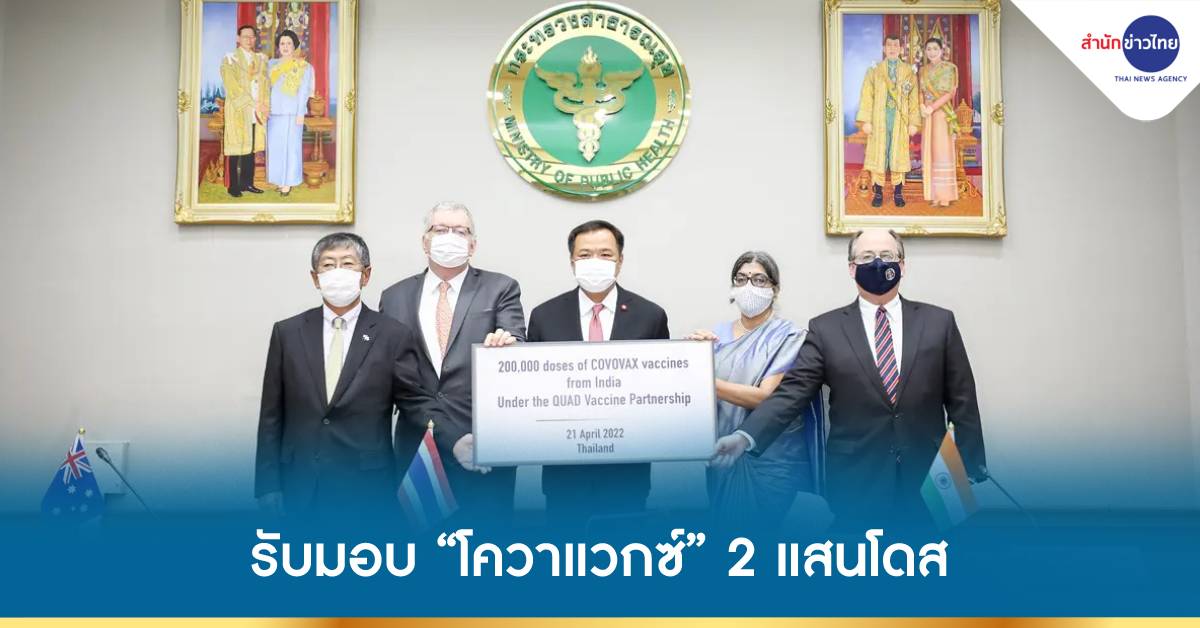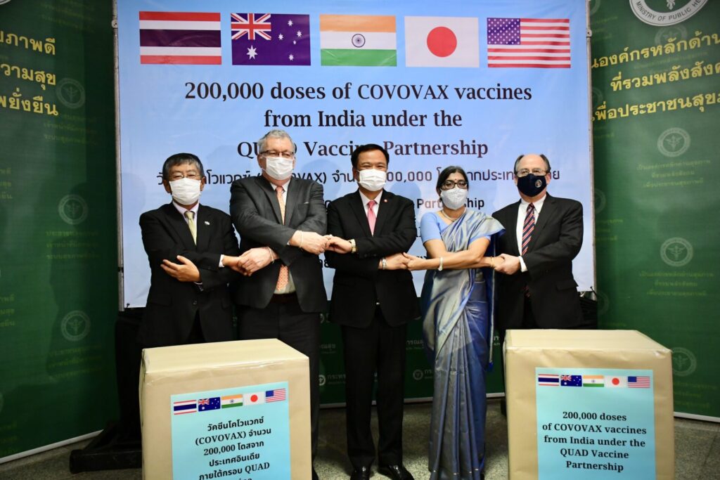 นายอนุทิน ชาญวีรกูล รองนายกรัฐมนตรีและรัฐมนตรีว่าการกระทรวงสาธารณสุข รับมอบวัคซีนโควิด COVOVAX ที่ผลิตในอินเดีย โดยได้รับการบริจาคจากจตุภาคีด้านความมั่นคง 4 ประเทศ ได้แก่ ออสเตรเลีย อินเดีย ญี่ปุ่น และสหรัฐอเมริกา จำนวน 200,000 โดส มูลค่า 60 ล้านรูปี หรือ 26 ล้านบาท เพื่อใช้ฉีดให้กับกลุ่มคนที่ยังไม่เคยได้รับวัคซีนมาก่อน หรือคนที่มีอาการแพ้วัคซีนชนิดอื่น ซึ่งวัคซีนที่ได้รับนี้เป็นวัคซีนชนิดโปรตีนซับยูนิต ต้องฉีดให้ครบ 2 เข็ม ระยะห่างระหว่างเข็ม 1 และ 2 คือ 3 สัปดาห์ และได้ผ่านการอนุมัติจาก อย.แล้ว เบื้องต้นมีการขออนุมัติการฉีดในคนอายุ 18 ปีขึ้นไป และเตรียมขออนุมัติใช้ในเด็กอายุ 12 ปี และกรมวิทยาศาตร์การแพทย์อยู่ระหว่างรับรองรุ่นการผลิต