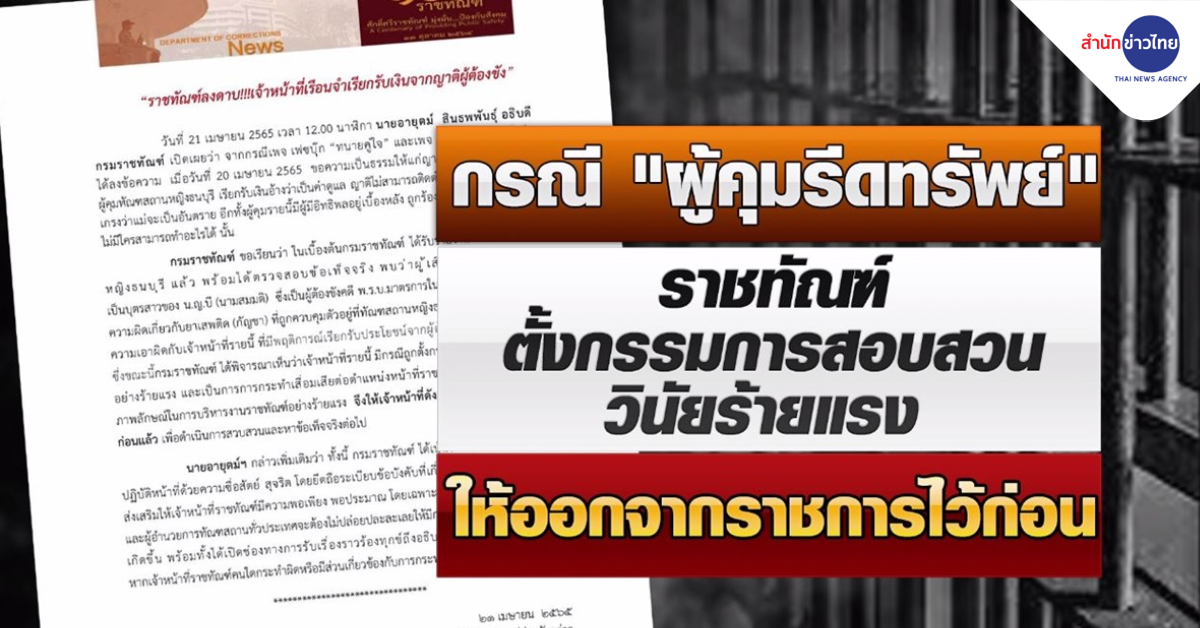 กรุงเทพฯ 21 เม.ย. – อธิบดีกรมราชทัณฑ์ เซ็นคำสั่งให้ผู้คุมเรือนจำที่เรียกรับเงินจากญาติผู้ต้องขัง ออกจากราชการไว้ก่อน พร้อมตั้งคณะกรรมการสอบวินัยร้ายแรงแล้ว