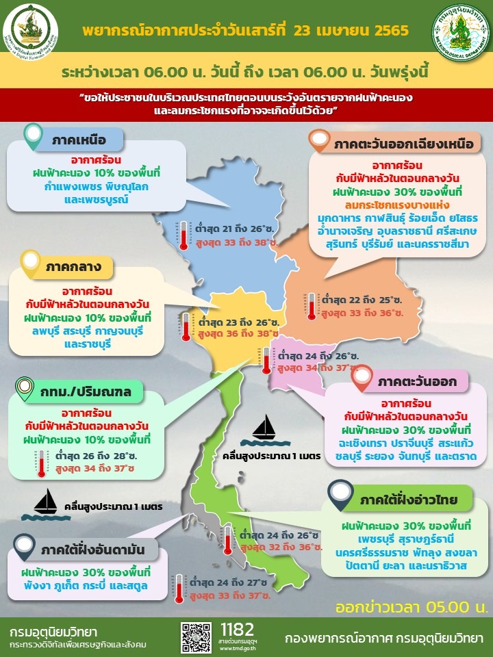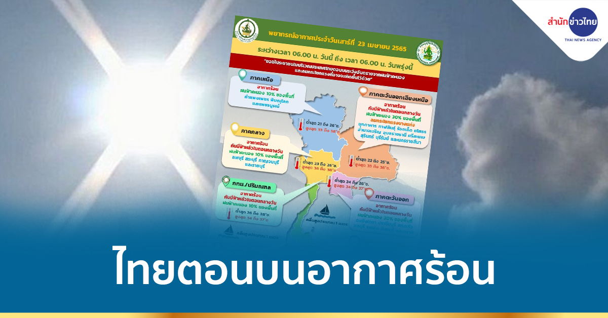 กทม. 23 เม.ย.- กรมอุตุฯ เผยไทยตอนบนมีอากาศร้อน ส่วนภาคเหนือ อีสาน กลาง และตะวันออก มีฝนฟ้าคะนองบางพื้นที่
