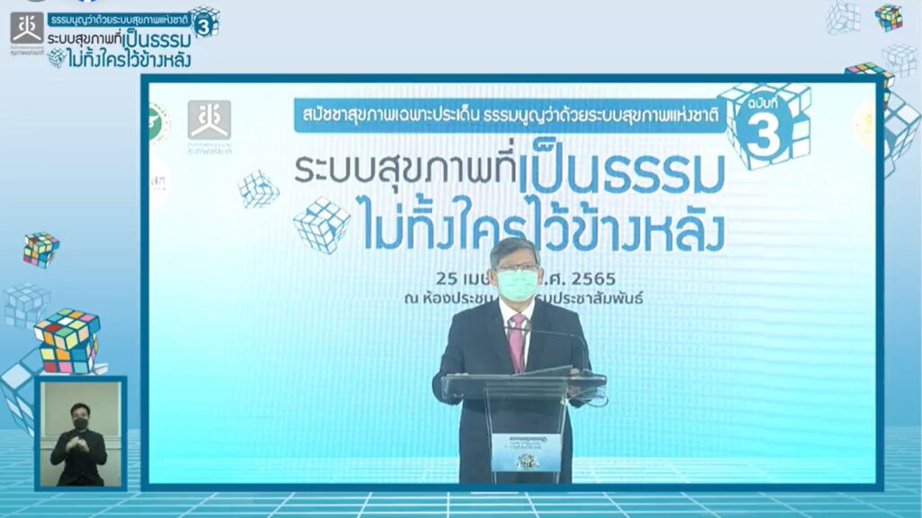 นายสาธิต ปิตุเตชะ รัฐมนตรีช่วยกว่าการกระทรวงสาธารณสุข กล่าวเปิดงานการจัดทำสมัชชาสุขภาพเฉพาะประเด็นธรรมนูญว่าด้วยระบบสุขภาพแห่งชาติ ฉบับที่ 3 “ระบบสุขภาพที่เป็นธรรม ไม่ทิ้งใครไว้ข้างหลัง” ว่าหลังจากธรรมนูญสุขภาพฉบับที่ 2 มีการใช้มานานตั้งแต่ปี 2559 จึงได้มีการยกร่างธรรมนูญสุขภาพฉบับที่ 3 ให้มีความทันสมัยสอดคล้องกับสถานการณ์ปัจจุบันครอบคลุมการเปลี่ยนแปลงทั้งในระดับประเทศและระดับโลก ทั้งนี้ วัตถุประสวค์หลักของเวทีสมัชชาสุขภาพ คือ เพื่อสร้างการรับรู้กระบวนการจัดทำธรรมนูญว่าด้วยระบบสุขภาพฯ, เพื่อรับฟังความคิดเห็นและให้ข้อเสนอเกี่ยวกับร่างธรรมนูญฯ เกิดข้อตกลงร่วมกัน และนำไปสู่ข้อสรุปการปรั[แก้ไขร่างฯ ซึ่งการยกร่างนี้ได้มีการตั้งคณะอนุกรรมการวิชาการและยกร่างธรรมนูญ, คณะอนุกรรมการการมีส่วนร่วมและรับฟังความคิดเห็น และคณะอนุกรรมการสื่อสารสังคม โดยมีเป้าหมายหลังของธรรมนูญฉบับที่ 3 นี้ คือระบบสุขภาพที่เป็นธรรมและไม่ทิ้งใครไว้ข้างหลัง