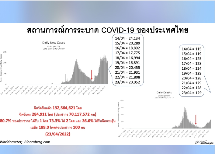 ศ.ดร.นพ.ประสิทธิ์ กล่าวว่า ขณะนี้ในต่างประเทศมีการรณรงค์การฉีดวัคซีนเข็ม 1 และ 2 เกือบ 80% ซึ่งประเทศที่คุมการระบาดได้ดี มักจะฉีดเข็มกระตุ้นกว่า 50% ตอนนี้สถานการณ์ในไทย ข้อมูล ณ 23 เม.ย.ที่ผ่านมา ฉีดวัคซีนไปแล้ว 132 ล้านโดส จากประชากร 70 ล้านคน ฉีดเข็ม 1 แล้ว 80% และ 3 ใน 4 ได้เข็มรับ 2 ส่วนคนที่ได้รับเข็มกระตุ้นเพียง 36% ทำให้ช่วงเวลานี้ยังต้องเร่งฉีดวัคซีน เพื่อให้จำนวนผู้เสียชีวิตเหลือแค่เลข 2 หลัก หนึ่งในข้อมูลที่จะบอกว่าผู้เสียชีวิตลดลง คือ ตัวเลขผู้ป่วยปอดอักเสบ ซึ่งขณะนี้ตัวเลขเริ่มนิ่งและไม่ขยับขึ้น หากเป็นเช่นนี้ ภายใน 1-2 สัปดาห์ คาดว่าผู้เสียชีวิตน่าจะลดลง