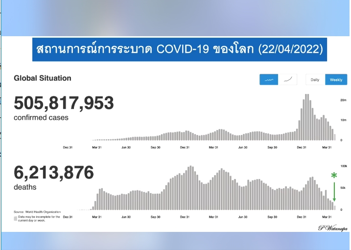 จากข้อมูลเมื่อ 22 เม.ย.ที่ผ่านมา พบว่าผู้ป่วยติดเชื้อกว่า 500 ล้านคนทั่วโลก เสียชีวิตกว่า 6 ล้านคน ขณะที่จำนวนการเสียชีวิตช่วงสัปดาห์ที่ผ่านมา ต่ำสุดนับตั้งแต่มีการระบาดของโควิด-19 ในปี 2563 ซึ่งเกิดจาก 2 ปัจจัย คือ ตัวสายพันธุ์ของไวรัสเอง และมีการฉีดวัคซีนไปแล้วจำนวนมากเกิดป้องกันและการเสียชิวตลดลง เมื่อดูการระบาดในต่างประเทศ พบว่าทวีปที่ถูกจู่โจมหนักสุด คือ ยุโรป อัตราการลดลงยังช้า เมื่อแทบกับอเมริกา แต่หากดูรายพื้นที่ ยุโรปขณะนี้เลยจุดพีคของการระบาดของโควิด-19 แล้ว สำหรับอเมริกาการแพร่ระบาดของโอไมครอนลดลงอย่างรวดเร็ว เช่นเดียวกับเอเชียตะวัออกเฉียงใต้ก็เริ่มลดลง จากข้อมูลตอนนี้พบว่าการแพร่ระบาดของโอไมครอนทั่วโลกมีแนวโน้มอยู่ในช่วงขาลง