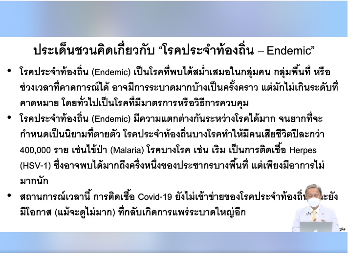 ถ้าดูคุณลักษณะของโรคประจำท้องถิ่นจะพบว่า ในเวลานี้การติดเชื้อโควิด-19 ยังไม่เข้าข่ายของโรคประจำท้องถิ่น และยังมีโอกาสที่จะกลับมาเกิดการแพร่ระบาดใหญ่อีก โดยมีปัจจัยเสี่ยงจากที่หลายประเทศมีการส่งสริมด้านเศรษฐกิจ การผ่อนคลายการเดินทางระหว่างประเทศ การส่งเสริมกิจกรรมสันทนาการ กิจกรรมที่มีเป้าหมายเพื่อกระตุ้นเศรษฐกิจ ทั้งหมดนี้เป็นปัจจัยที่อาจจะมีความเสี่ยงทำให้โควิด-19 กลับมาแพร่ระบาด ไม่ได้หมายความว่าไม่ทำ ยังไงก็ต้องทำให้เศรษฐกิจฟื้นตัว แต่จะต้องบริหารความเสี่ยง โดยเน้นการป้องกันและการรักษา แม้การป้องกันจะยาก แต่เราสามารถลดจำนวนได้