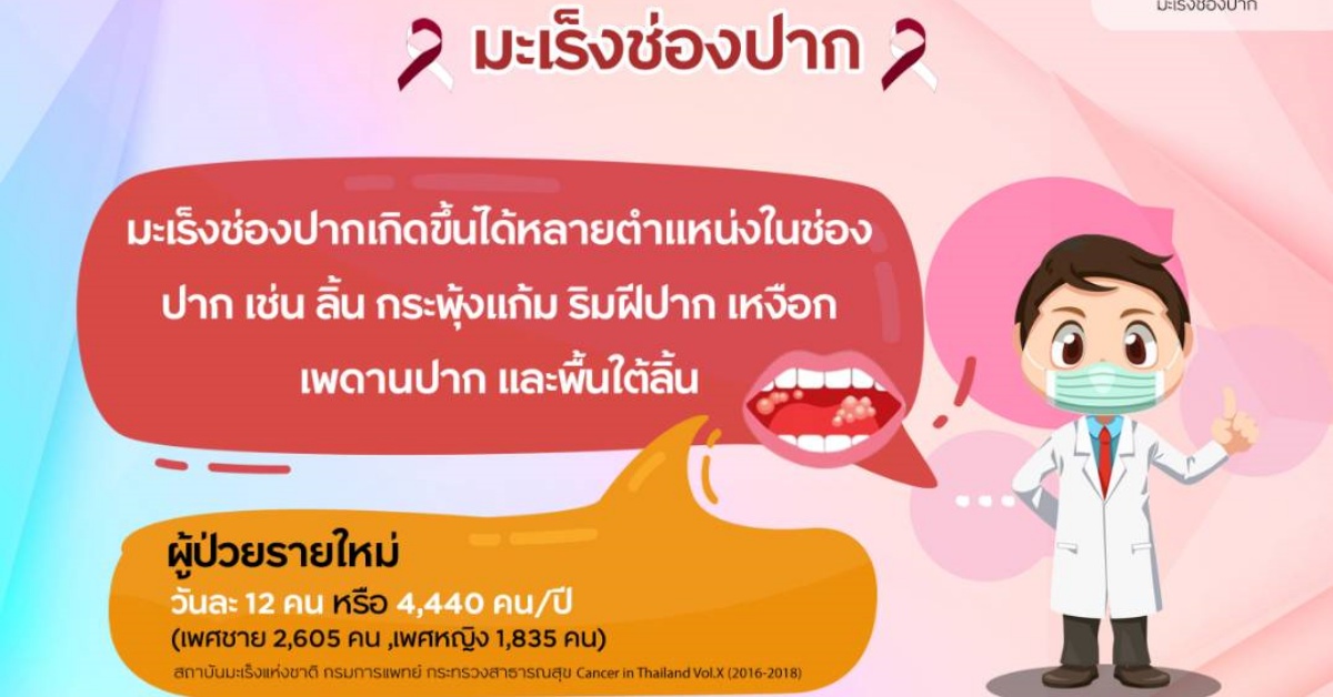 นพ.สมศักดิ์ อรรฆศิลป์ อธิบดีกรมการแพทย์ กล่าวว่า มะเร็งช่องปากเกิดขึ้นจากความผิดปกติของการพัฒนาเซลล์ในช่องปาก แม้ว่าจะยังไม่ทราบสาเหตุที่แน่ชัดของความผิดปกติดังกล่าว แต่พบว่ามีปัจจัยบางประการที่เพิ่มความเสี่ยงการเกิดมะเร็งช่องปากได้ เช่น การสูบบุหรี่ ดื่มเหล้า การเคี้ยวหมาก การติดเชื้อไวรัส Human papilloma virus (HPV) หรือการมีแผลเรื้อรังในช่องปาก เป็นต้น อาการส่วนใหญ่ของมะเร็งในช่องปากพบได้หลายลักษณะ เช่น การมีฝ้าขาวๆ ที่บริเวณใต้ลิ้น เหงือก พื้นช่องปาก เมื่อมีอาการเรื้อรังเป็นเวลานาน รอยฝ้านั้นอาจนูนขึ้นเป็นก้อน หรือกรณีเกิดแผลจะมีลักษณะคล้ายอาการร้อนใน แต่จะมีอาการเรื้อรังมากกว่า 1 เดือน มีเลือดไหลในช่องปากโดยไม่ทราบสาเหตุ มะเร็งของลิ้นหรือลำคอในบางตำแหน่งอาจทำให้เกิดการเจ็บในหูขณะกลืนอาหารได้ เนื่องจากมีเส้นประสาทร่วมกัน หากมีอาการผิดปกติดังกล่าวผู้ป่วยควรรีบปรึกษาแพทย์เพื่อการวินิจฉัยและรักษาตั้งแต่ในระยะไม่ลุกลาม