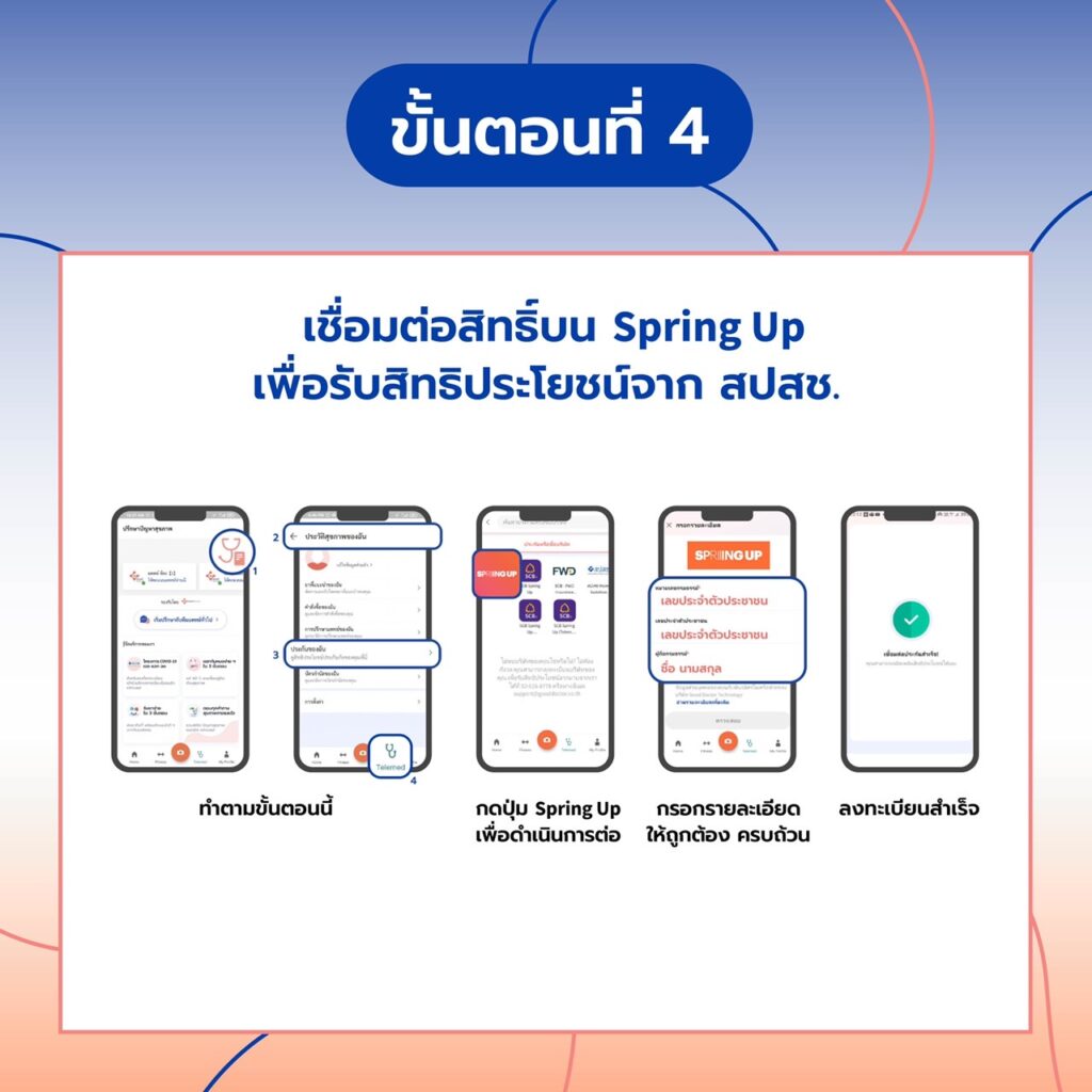 โดยผู้ป่วยกลุ่มดังกล่าวที่มีผล ATK เป็นบวก สามารถดาวน์โหลดแอปพลิเคชัน SPRING UP เพื่อลงทะเบียนเข้ารับการรักษาด้วยระบบการแพทย์ทางไกล ผู้ป่วยจะสามารถแชทขอคำแนะนำและปรึกษาทีมแพทย์ผ่านออนไลน์ รวมถึงสามารถรับบริการจัดส่งยาตามแพทย์สั่งถึงบ้าน นอกจากนี้ ระบบจะติดตามอาการเมื่อครบ 48 ชั่วโมง โดยที่ผู้ป่วยไม่จำเป็นต้องเดินทางไปที่โรงพยาบาล มุ่งช่วยลดความเสี่ยงและคลายความกังวลใจให้ผู้ป่วย เราหวังเป็นอย่างยิ่งว่าแอปฯ “SPRING UP” จะเป็นอีกหนึ่งช่องทางที่สามารถช่วยเหลือผู้ป่วยกลุ่มสีเขียวให้สามารถเข้าถึงบริการทางการแพทย์ได้อย่างสะดวก รวดเร็ว เพื่อช่วยลดความรุนแรงของโรคท่ามกลางสถานการณ์การแพร่ระบาดที่ทวีความเข้มข้นได้อย่างทันท่วงที”