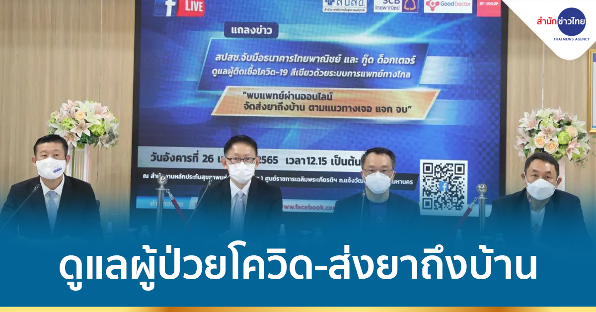 เมื่อวันที่ 26 เมษายน 2565 ณ สำนักงานหลักประกันสุขภาพแห่งชาติ (สปสช.) ศูนย์ราชการเฉลิมพระเกียรติฯ ถ.แจ้งวัฒนะ กทม. มีการแถลงข่าวเรื่อง สปสช.จับมือธนาคารไทยพาณิชย์ และกู๊ด ด็อกเตอร์ ดูแลผู้ติดเชื้อโควิด-19 สีเขียว ด้วยระบบการแพทย์ทางไกล “พบแพทย์ผ่านออนไลน์ จัดส่งยาถึงบ้าน ตามแนวทางเจอ แจก จบ”
