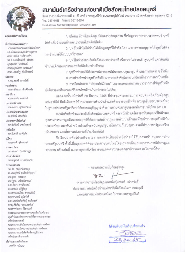 วันที่ 1 พฤษภาคม 2565 ศ.เกียรติคุณ พญ.สมศรี เผ่าสวัสดิ์ ประธานสมาพันธ์เครือข่ายแห่งชาติเพื่อสังคมไทยปลอดบุหรี่ กล่าวว่า เมื่อวันที่ 26 เมษายนที่ผ่านมา สมาพันธ์เครือข่ายแห่งชาติเพื่อสังคมไทยปลอดบุหรี่ ได้ยื่นจดหมายเปิดผนึกถึงนายกรัฐมนตรีและคณะรัฐมนตรีทุกท่าน เพื่อให้ข้อมูลสนับสนุนการห้ามนำเข้าและจำหน่ายบุหรี่ไฟฟ้าในประเทศไทย โดยมีใจความสำคัญ คือ ขณะนี้มีบทเรียนจากหลายประเทศที่ไม่ห้ามขายบุหรี่ไฟฟ้า ต้องประสบปัญหาอัตราการสูบบุหรี่ไฟฟ้าในกลุ่มเด็กและเยาวชนเพิ่มสูงขึ้นอย่างน่าเป็นห่วง จนเป็นสาเหตุให้ประเทศต่างๆ ออกกฎหมายห้ามนำเข้าและจำหน่ายบุหรี่ไฟฟ้าเพิ่มมากขึ้นเรื่อยๆ ซึ่งปัจจุบันตามรายงานขององค์การอนามัยโลก มีประเทศที่ห้ามบุหรี่ไฟฟ้าแล้ว จำนวน 32 ประเทศ