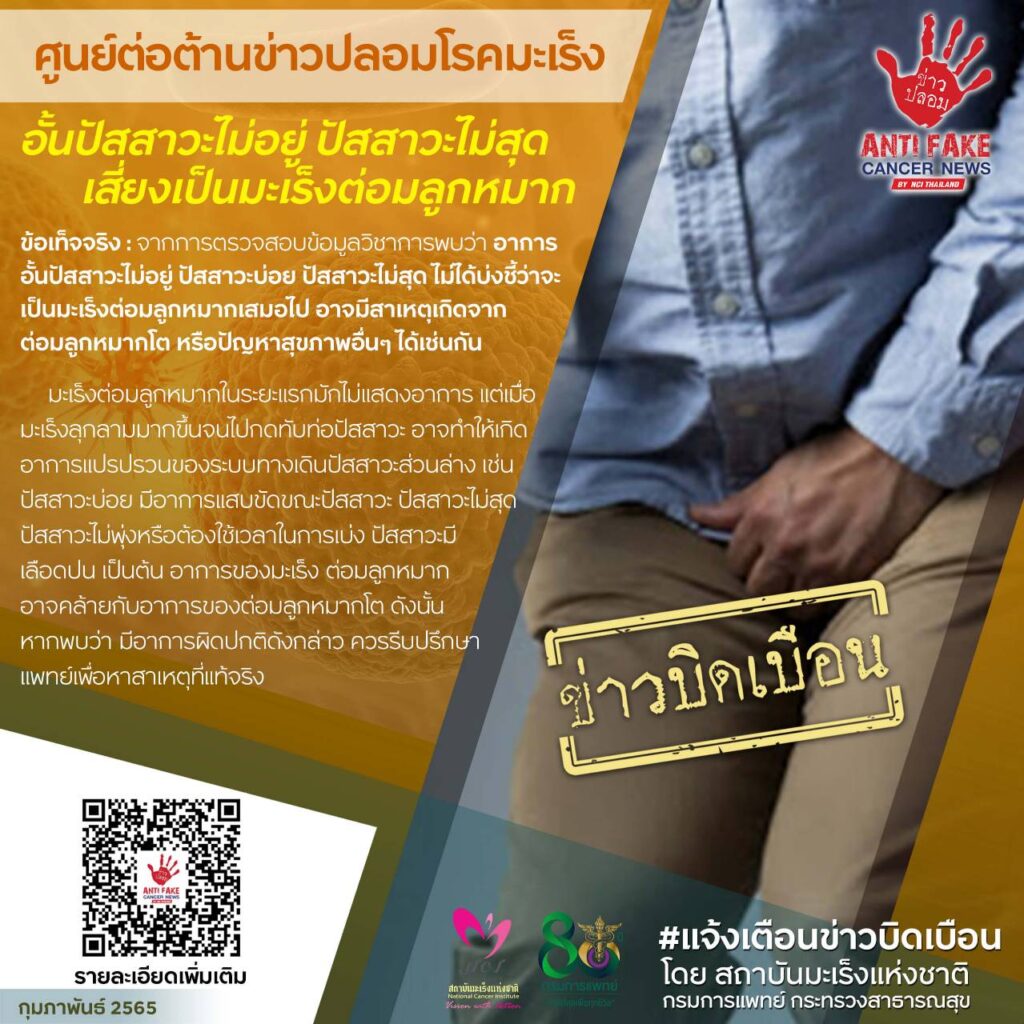 ตามที่มีข่าวปรากฏในสื่อต่าง ๆ เกี่ยวกับประเด็นเรื่อง “อั้นปัสสาวะไม่อยู่ ปัสสาวะบ่อย ปัสสาวะไม่สุด เสี่ยงเป็นมะเร็งต่อมลูกหมาก” กรมการแพทย์ โดย สถาบันมะเร็งแห่งชาติ ได้ดำเนินการตรวจสอบข้อเท็จจริงพบว่า อาการอั้นปัสสาวะไม่อยู่ ปัสสาวะบ่อย ปัสสาวะไม่สุด ไม่ได้บ่งชี้ว่าจะเป็นมะเร็งต่อมลูกหมากเสมอไป อาจมีสาเหตุเกิดจากต่อมลูกหมากโต การติดเชื้อหรือปัญหาสุขภาพอื่น ๆ ได้เช่นกัน