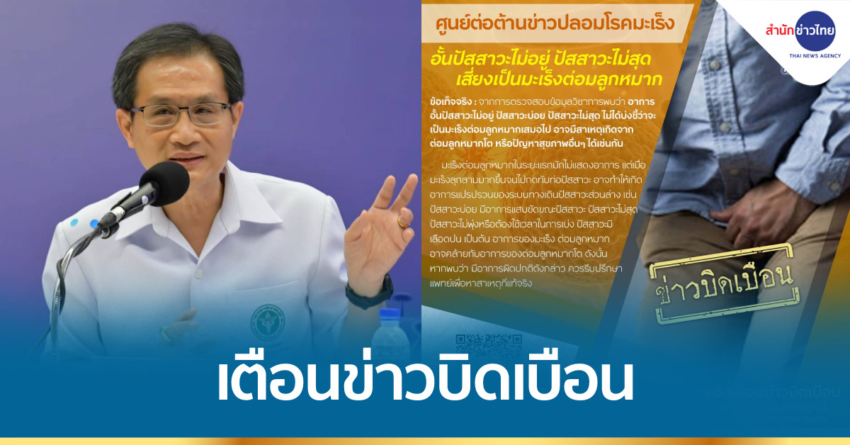 กรุงเทพฯ 2 พ.ค. – สถาบันมะเร็งแห่งชาติ แจ้งเตือนข่าวบิดเบือน “อั้นปัสสาวะไม่อยู่ ปัสสาวะไม่สุด เสี่ยงเป็นมะเร็งต่อมลูกหมาก”