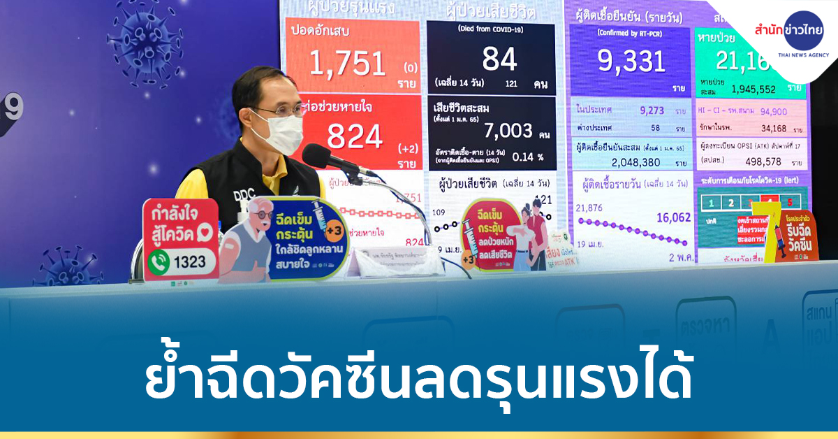 สธ. 2 พ.ค.- ก.สาธารณสุข เผยสถานการณ์โควิด-19 แนวโน้มลดลง แต่บางจังหวัดในภาคอีสานยังพบการติดเชื้อสูง ย้ำ “โอไมครอน” หากไม่ฉีดวัคซีนเข็มกระตุ้นอาจอาการรุนแรงและเสียชีวิตได้ ต้องเร่งนำผู้สูงอายุไปฉีดวัคซีน