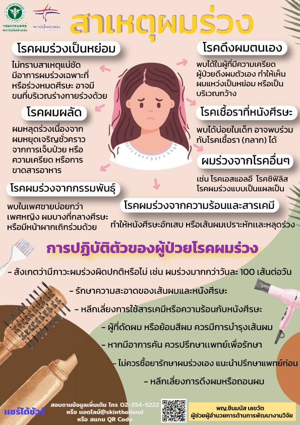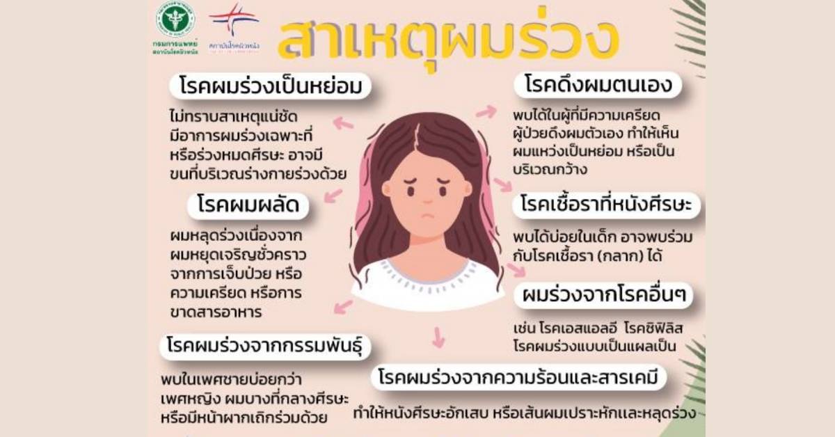 พญ.มิ่งขวัญ วิชัยดิษฐ ผู้อำนวยการสถาบันโรคผิวหนัง กรมการแพทย์ ให้ข้อมูลเพิ่มเติมถึงสาเหตุของภาวะผมร่วงว่า สาเหตุของภาวะผมร่วงนั้น เกิดได้หลายสาเหตุ คือ 1.ผมร่วงจากกรรรมพันธุ์ สามารถพบได้ทั้งชายและหญิง แต่ส่วนใหญ่มักพบในเพศชาย เห็นเป็นเส้นขนอ่อนๆ ทำให้ผมบริเวณนั้นดูบางลง ส่วนมากจะเป็นบริเวณกลางศีรษะและหน้าผาก 2.ผมผลัด เกิดผมร่วงเนื่องจากผมหยุดเจริญชั่วคราวจากการเจ็บป่วยหรือความเครียดมากๆ หรือขาดสารอาหารเช่นเหล็กหรือวิตามินดี ทำให้วงจรชีวิตเส้นผมที่กำลังเจริญมีการหยุดเจริญและหลุดร่วงมากกว่าปกติ 3.ผมร่วงเป็นหย่อม เกิดขึ้นโดยไม่ทราบสาเหตุแน่ชัด จะมีอาการผมร่วงเฉพาะที่ บริเวณผมที่ร่วงจะมีลักษณะกลมหรือรี ขอบเขตชัดเจน ตรงกลางไม่มีเส้นผมหนังศีรษะในบริเวณนั้น ไม่แดง ไม่เจ็บ ไม่คัน ไม่เป็นสะเก็ด หรือเป็นขุย