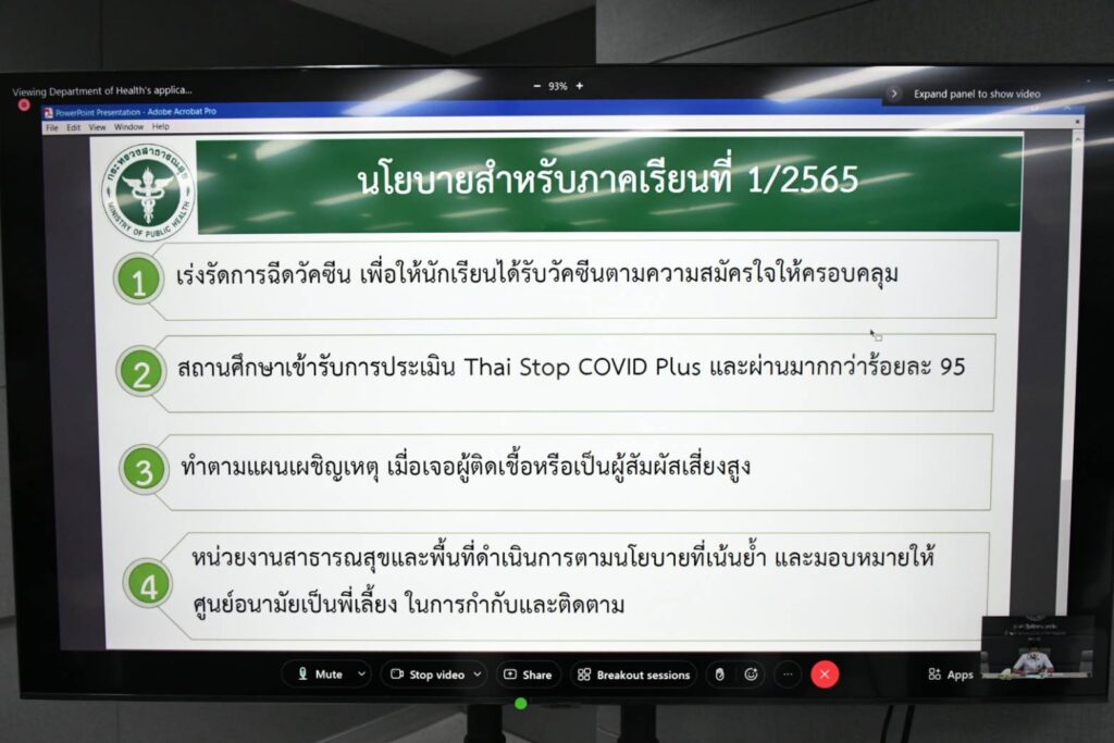 นพ.สุวรรณชัย วัฒนายิ่งเจริญชัย อธิบดีกรมอนามัย กล่าวว่า มาตรการต่างๆ ในการเปิดภาคเรียนนี้ ปรับเปลี่ยนตามสถานการณ์ที่ไม่เหมือนเดิมอีกต่อไป การพบเด็กติดเชื้อไม่จำเป็นต้องปิดชั้นเรียน หรือปิดโรงเรียนอีกต่อไป เพียงแค่โรงเรียนปฏิบัติตามแผนที่ได้ทำไว้เท่านั้น สถานการณ์ปัจจุบันจำนวนเด็กรับวัคซีนมากขึ้น 12-17 ปี ส่วนใหญ่เหลือการรับวัคซีนเข็มกระตุ้น หรือเข็ม 3 ส่วนเด็กเล็ก 5-11 ปี แบ่งเป็นรับเข็ม 1 แล้ว 50% และเข็ม 2 อยู่ที่ 13% เมื่อสัดส่วนของนักเรียนที่รับวัคซีน มีมากขึ้นทำให้หากพบเด็กเสี่ยงสูง ไม่จำเป็นต้องปิดชั้นเรียนหรือปิดโรงเรียนอีกต่อไป แต่ให้แบ่งเป็น