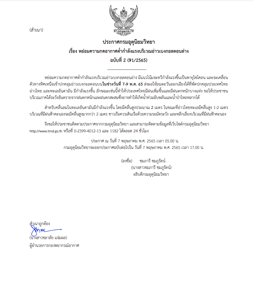 หย่อมความกดอากาศต่ำกำลังแรงบริเวณอ่าวเบงกอลตอนล่าง มีแนวโน้มจะทวีกำลังแรงขึ้นเป็นพายุไซโคลน และจะเคลื่อนตัวทางทิศเหนือเข้าปกคลุมอ่าวเบงกอลตอนบนในช่วงวันที่ 7-9 พ.ค. 65 ส่งผลให้ลมตะวันออกเฉียงใต้ที่พัดปกคลุมประเทศไทย อ่าวไทย และทะเลอันดามัน มีกำลังแรงขึ้น ลักษณะเช่นนี้ทำให้ประเทศไทยมีฝนเพิ่มขึ้นและมีฝนตกหนักบางแห่ง ขอให้ประชาชนบริเวณภาคใต้ระวังอันตรายจากฝนตกหนักและฝนตกสะสมซึ่งอาจทำให้เกิดน้ำท่วมฉับพลันและน้ำป่าไหลหลากได้